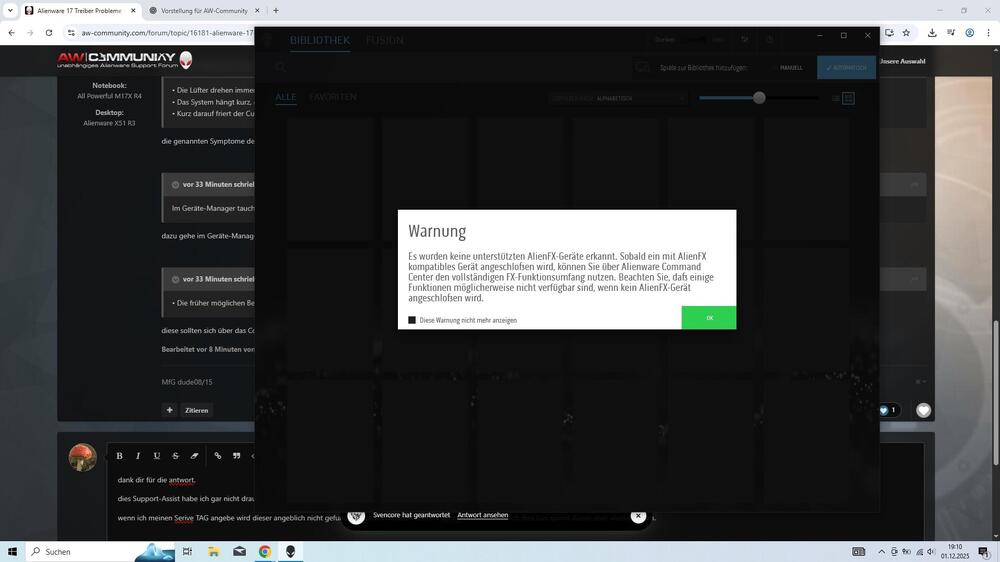 vielen Dank für die Rückmeldung. Ich habe das Support-Assist-Programm leider gar nicht auf meinem Laptop installiert. Wenn ich meinen Service-Tag eingebe, wird dieser scheinbar nicht erkannt, und das Programm versucht, nach meinem Laptop zu suchen. Sobald ich dies zulasse, funktioniert es jedoch nicht richtig. bzw fängt mein laptop irgendwann wieder so extrem Hoch zu drehen etc. Im Geräte-Manager kann ich bei den ersten beiden Geräten nur die Details aufrufen; Hardware-IDs werden leider nicht angezeigt (siehe angehängter Screenshot). Bei den nächsten drei Geräten erscheinen folgende Werte: ACPI\CPL0002\2&DABA3FF&0 ACPI\DELLABCE\2&DABA3FF&0 ACPI\SMO8810\1 Zudem zeigt das Command Center an, dass keine unterstützten AlienFX-Geräte erkannt wurden (auch hierzu habe ich einen Screenshot beigefügt). Vielen Dank für Ihre Zeit und Mühe! Ich würde mich sehr freuen, wenn mein Laptop wieder einwandfrei funktioniert, sodass ich nach und nach wieder mit dem Spielen anfangen kann – auch wenn es zunächst nur ältere Titel sein werden. Beste Grüße, -