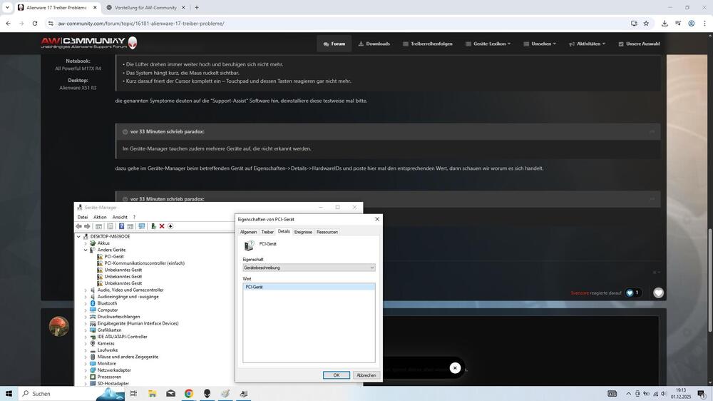 Guten Abend, liebe Community, ich melde mich nach längerer Zeit wieder – ich hatte mich damals schon einmal vorgestellt, war aber wegen Corona und einer langen Ausfallzeit komplett abgetaucht. Jetzt bin ich wieder da und hoffe sehr auf eure Unterstützung, denn ich komme mit meinem Alienware 17 aktuell überhaupt nicht mehr klar. Ich habe den Laptop vor vielen Jahren besessen und nun von meinem Bruder zurückbekommen. Das Gerät stand lange ungenutzt herum, daher habe ich ihn komplett neu aufgesetzt, neue Wärmeleitpaste aufgetragen und alles vorbereitet. Direkt nach der frischen Installation läuft er problemlos – aber sobald Windows anfängt, Updates zu installieren, fangen die Schwierigkeiten an: • Die Lüfter drehen immer weiter hoch und beruhigen sich nicht mehr. • Das System hängt kurz, die Maus ruckelt sichtbar. • Kurz darauf friert der Cursor komplett ein – Touchpad und dessen Tasten reagieren gar nicht mehr. • Selbst die blaue Beleuchtung des Touchpads geht in dem Moment aus. • Nur die Tastatur funktioniert weiterhin, aber der Laptop hört nicht auf hochzudrehen. • Dasselbe Verhalten tritt auf, wenn ich Dells automatisches Erkennungstool für Treiber nutze. Manuell installierte Treiber funktionieren zwar einigermaßen, aber es fehlt eindeutig einiges: • Die Webcam wird nicht erkannt. • Ich bin unsicher, ob das Touchpad überhaupt richtig installiert ist. • Die früher möglichen Beleuchtungs-/Farbeinstellungen fehlen komplett. • Und generell weiß ich nicht, ob ich wirklich die passenden Treiber verwende, da das Modell in verschiedenen Hardwarevarianten verkauft wurde. Ich habe inzwischen auch ein paar alte Titel von früher angespielt – und grundsätzlich läuft alles stabil. Trotzdem habe ich ständig im Hinterkopf, dass vielleicht falsche oder unvollständige Treiber installiert sind. Im Geräte-Manager tauchen zudem mehrere Geräte auf, die nicht erkannt werden. Interessant ist: Ich habe die Rubrik gefunden, in der mein Laptop offiziell aufgelistet ist, inklusive der empfohlenen Reihenfolge für die Treiberinstallation. Das habe ich bisher nicht genau so gemacht, sondern eher nach eigenem Ermessen Treiber von der Dell-Seite gesucht und installiert. Ich hatte gehofft, dass man die Treiber direkt über die Webseite laden kann, ohne das Identifikationstool zu nutzen, da ich jedes Mal ein bisschen Angst habe, dass das Tool den Laptop wieder zum Hochdrehen der Lüfter bringt oder das System anderweitig spinnt. Zur Orientierung, das weiß ich sicher über mein Gerät: 🧠 CPU: Intel Core i7-4700MQ (Haswell, 4 Kerne / 8 Threads, 47W) 🎨 GPU: NVIDIA GeForce GTX 880M (8 GB GDDR5) 💾 RAM: 16 GB DDR3L (vermutlich 1600 MHz) Wenn hilfreich, kann ich gern einen Screenshot vom Geräte-Manager nachreichen. Ich würde mich wirklich freuen, wenn mir jemand helfen kann – egal ob es um die richtigen Treiber, typische Fehlerquellen oder bekannte Probleme bei diesem Modell geht. Vielen Dank schon einmal im Voraus!