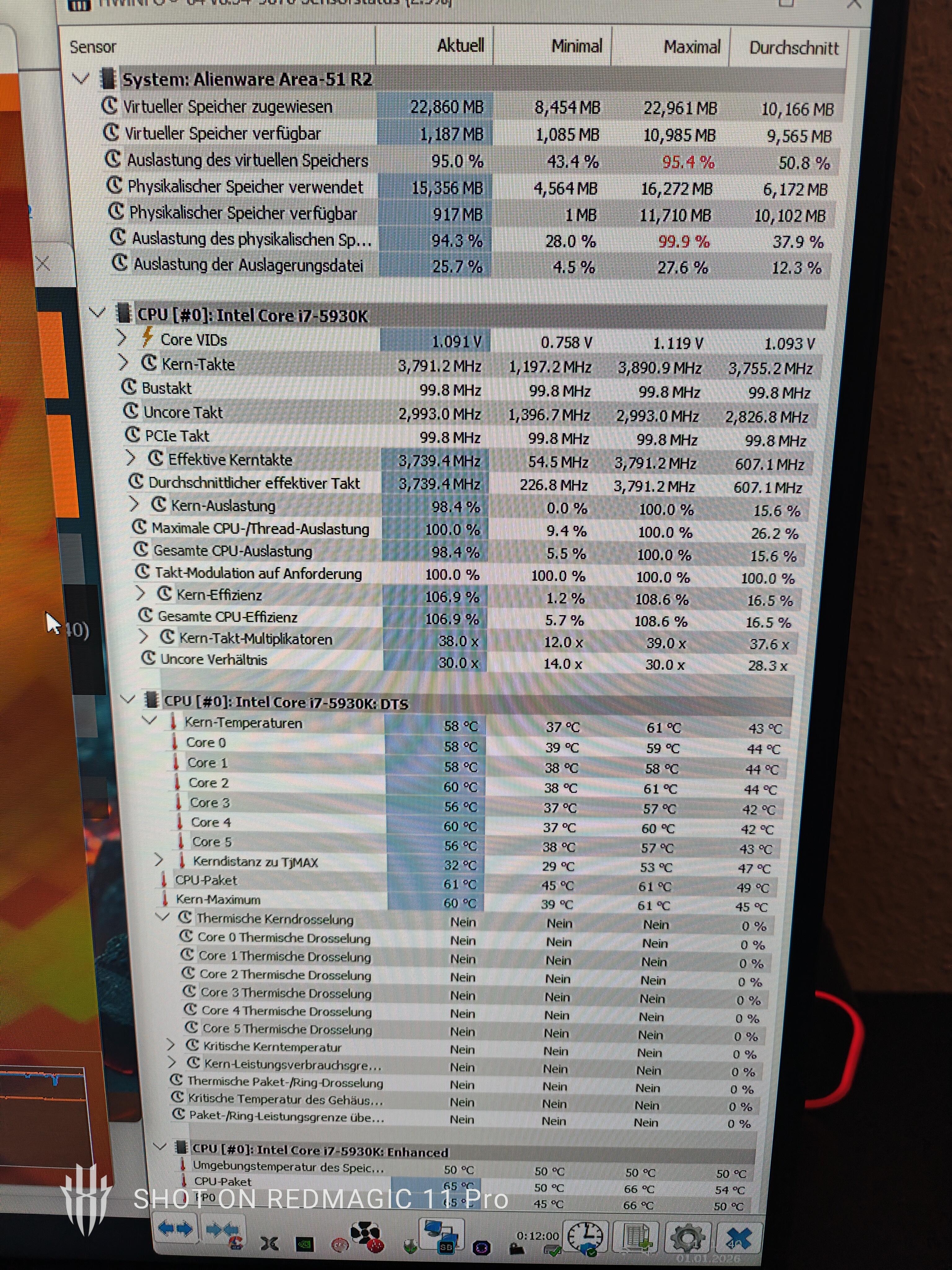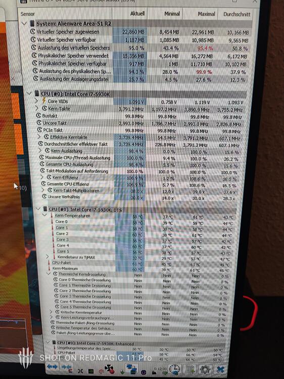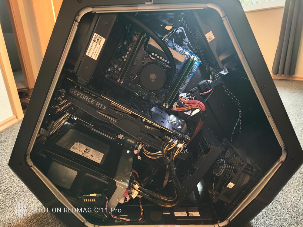 Was macht man wenn man immer noch nicht genug vom PC Schrauben hat, der Stiefsohn nicht da ist und die Frau Arbeitet und man auch mal an was vernünftigem "eigenen" Zeug was offen hat? Genau , man bastelt an "seinen" Aliens rum und geht anschließend zufrieden eine schöne Hunderunde 😉. In diesem Fall an meinem AW Area 51 R2 den der Stiefsohn zur Nutzung in seinem Zimmer stehen hat, aus Platzmangel bei mir, mein Zimmer ist schon voll 🫣😅🙈. WLP endlich mal erneuern,CPU Kühler richten, der schon lange verdreht verbaut war. Alles in ca. ner Std. erledigt und ich denke alles soweit richtig gemacht, Temp's sind gut finde ich, 15min. Furmark und Prime95 reichte mir, OK die GPU könnte etwas kühler laufen aber das kann ich mit den Gehäuselüftern noch anpassen, der Alienhead ist endlich gerade wie vom Werk montiert gewesen und die Leitungen nicht mehr auf Zug/Spannung.👍Den RGB RAM musste ich ausbauen und den originalen vorerst montieren damit er erstmal spielen kann. Eine LED spinnt, muss nachgelötet werden, geht ja bei mir gar nicht sowas und die Riegel gereinigt werden. Das war's aber vorerst, jetzt besteht erstmal kein Wartungsstau an meinen Rechnern mehr😉 sorry für Offtopic. 👋 Das letzte Bild wie vorher war😵