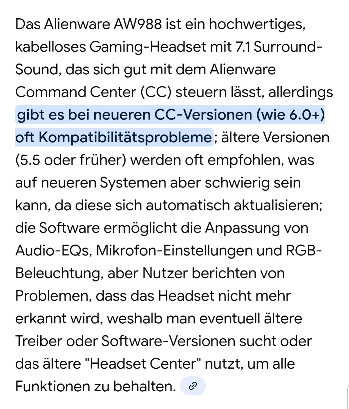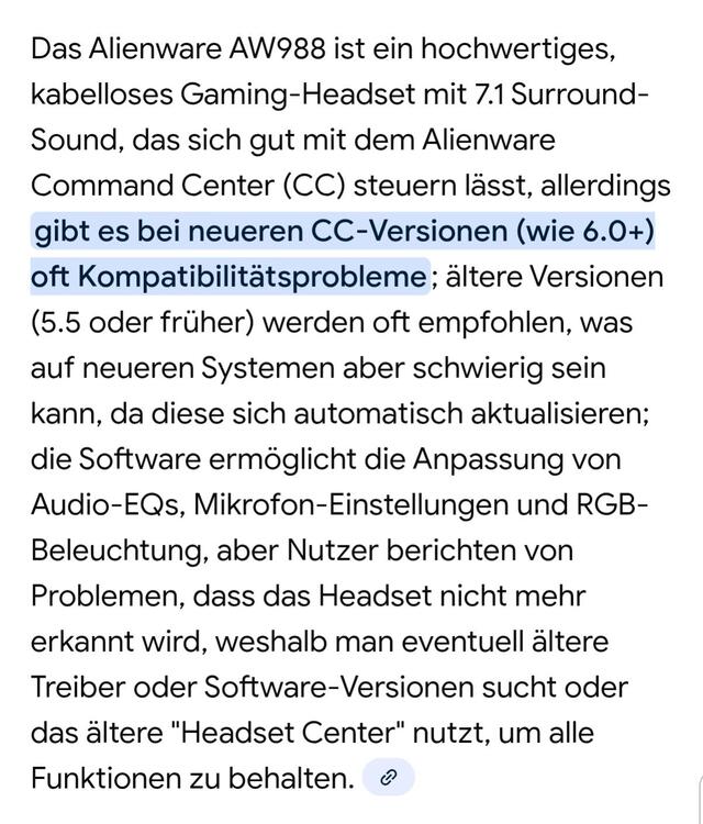 2. Moin, Ist zwar schon etwas älter der Thread hier, aber aus aktuellem Anlass nochmal die Frage in die Runde bezüglich des ganz neuen CC. Ich habe heute nach langer Zeit mal wieder mein Headset AW 988 benutzen wollen und die Farben ändern usw. Das ganz neue CC, (v.6), auf meinem Aurora R14 Ryzen hat alle "älteren" Geräte rausgeschmissen, auch den Monitor,(AW3418HW). Der Monitor ist nicht so wild ,den kann man ja auch immer noch über das OSD einstellen. Aber das Headset nicht, es funktioniert zwar , aber Farben ändern usw. ist nicht mehr möglich. Bei meinem Schwiegervater hat sich das CC automatisch auf die ganz neue Version installiert obwohl er nur eine ältere AW Tastatur dran hat , (ich glaube irgendwas mit AW 768), die ist nun auch verschwunden. Echt Klasse Dell🤬Wie habt ihr das zwischenzeitlich gelöst? Das sagt die KI dazu: (Hat jemand die eigenständige Headset Software noch?)