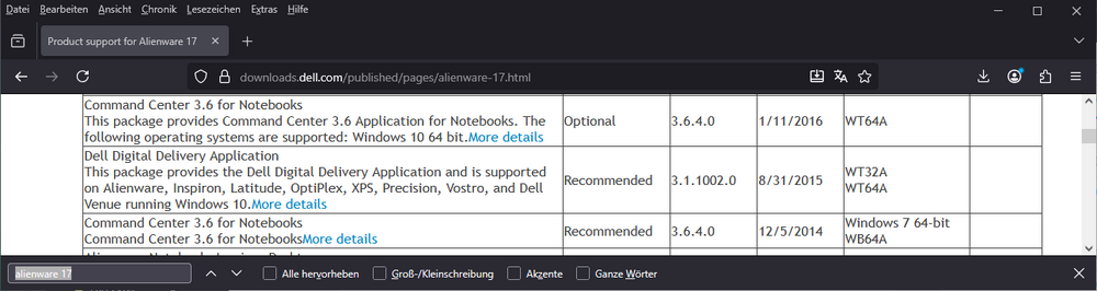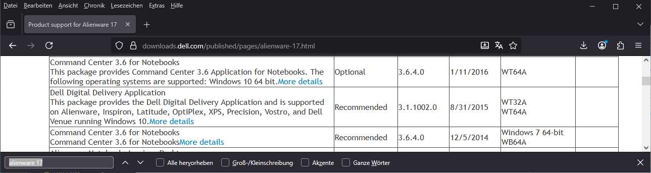 Hi @eltonnov, nach deinem Service TAG handelt es sich um ein "Alienware 17 R1". Und du hast recht, für Windows 10 ist kein AWCommanCenter auf der Support-Seite mehr verfügbar - für Windows 7 bzw. 8.1 aber schon. Sollten sich diese älteren Versionen nicht installieren lassen gab es aber auch eine AWCC Version für Windows 10 auf dieser Webseite (siehe folgendes Bild:) Der Link führte zu folgender Webseite: http://www.dell.com/support/home/drivers/DriversDetails?productCode=alienware-17&driverId=7YT4T welche jetzt aber nur noch einen Fehler ausgibt. Ich habe im Netz noch eine entsprechende, für's Alienware 17 Windows 10 kompatible, AWCC Version vom Alienware 14 unter der driverid=7YT4T gefunden. Verwendung auf eigene Gefahr: https://www.driverguide.com/driver/detail.php?driverid=2005695 (Button "DownloadNow - DriversGuide Secure Download) - Heute