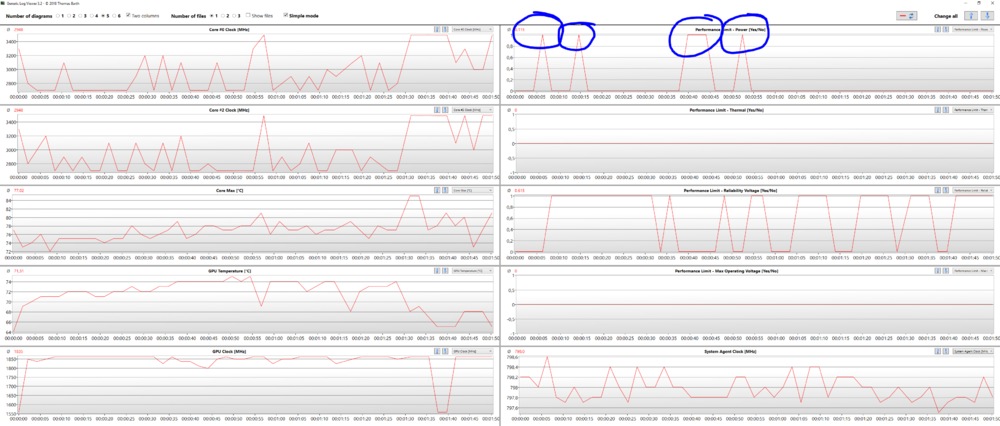 2. Hey @espresso was @Jörg geschrieben hat solltest du beachten. Immer das neuste Windows 10 mit dem Media Creation Tool erstellen, damit installierst du die Treiber erst nachdem die Windows 10 Upgrade eingespielt werden. Ich habe mir den Log mal angeschaut, der zeigt noch keine 2 Minuten. Die CPU und GPU (im Bild links, die Werte der verschiedenen CPU Kerne sind sehr ähnlich zu den zwei gezeigten) Werte sind gut, Temperaturen nicht zu hoch und der Takt wird eigentlich auch gut gehalten. Der CPU Takt fällt ab, von ~3,4 auf ~2,7 GHz, was ein paar FPS kosten sollte aber nicht wie von dir beschrieben "freezes" auftreten sollten. Das kommt erst wenn die CPU auf 800 MHz fällt. Als Performance Limit (rechts) wird u.a. 4 mal 'Power' genannt, es ist nicht genug Strom vorhanden. Ich hätte jetzt den Rat gegeben die CPU zu undervolten, aber das hast du ja schon gemacht und es hat nicht geholfen. Welches Netzteil hast du? Es sollten das mind. 240 Watt sein. Hast du noch ein zweites um damit zu testen? Es kann sein, dass das System kurz komplett hängt wegen Power Limit, das ist aber nicht normal. Falls es nicht am Netzteil liegt würde ich mich an Dell wenden, Garantie sollte ja noch vorhanden sein wenn du es letztes Jahr im Sommer gekauft hast.