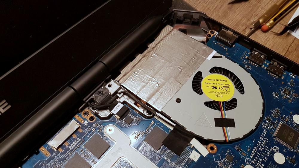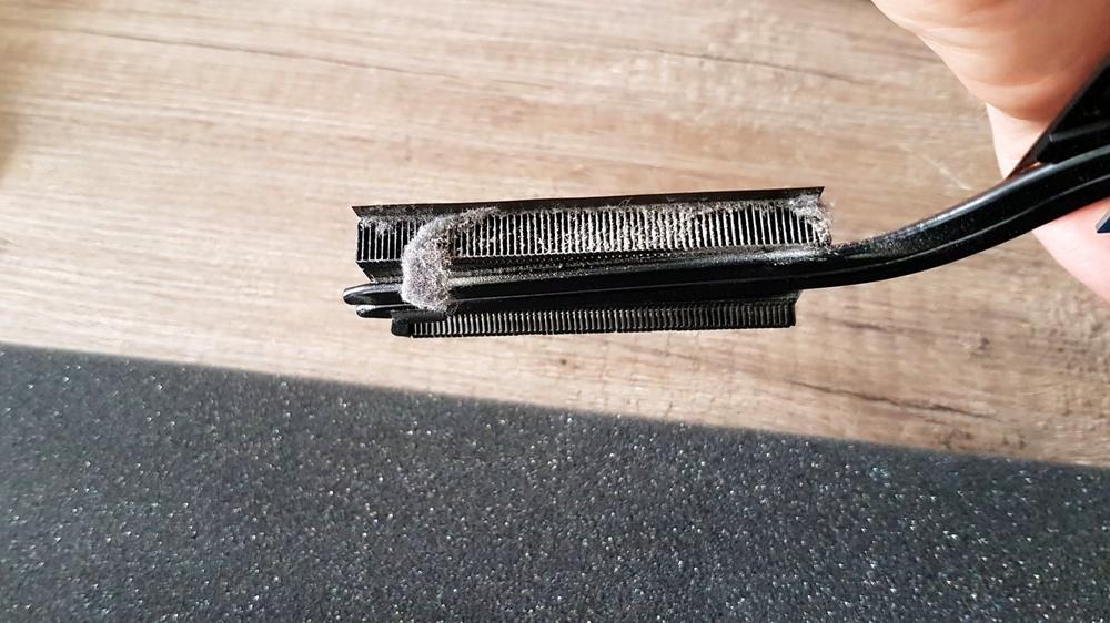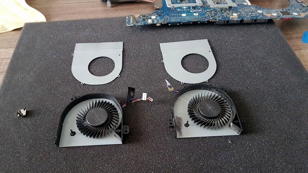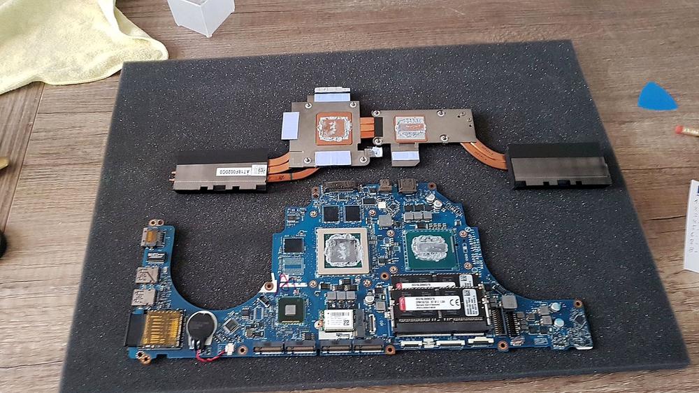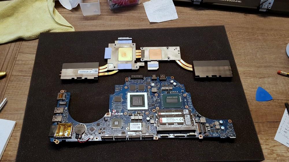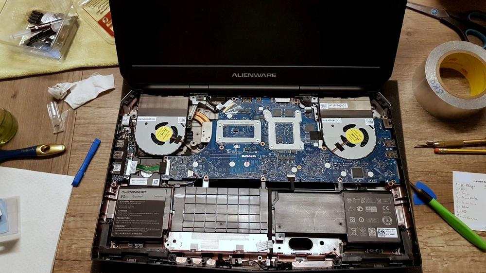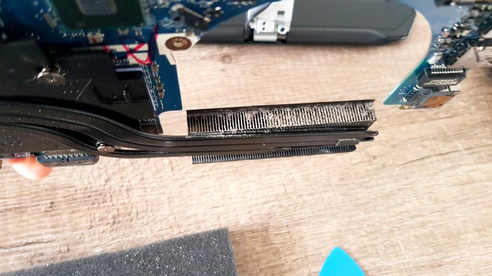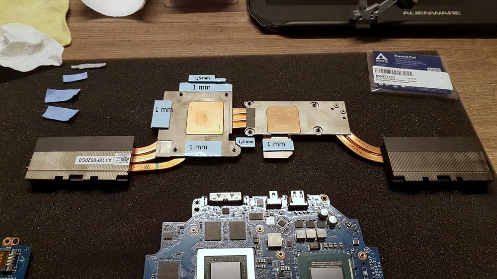 Vor einigen Tagen habe ich mir ein zweites Alienware Notebook ins Haus geholt. Zwar kein R4, aber dennoch wie ich finde ein sehr schönes und immer noch leistungsstarkes Notebook. Die Ausstattung sieht wie folgt aus: Alienware 17 R2 (Mitte 2015) CPU: i7 4710 HQ GPU: Nvidia GTX 970M RAM: 16 GB HyperX Impact @ 1600 MHz Full HD IPS Panel (matt) 3x 250 GB M.2 SSD Samsung 860 EVO 1x 1 TB Standard HDD WLAN: Killer 1525 + BT Das Notebook habe ich für meine Freundin gekauft, damit Sie mich besser beim Videoschnitt unterstützen kann (und damit ich sie nicht so oft an meinen geliebten R4 lassen muss^^) da ich wirklich oft und viele Videos schneiden und bearbeiten muss. Da sie nicht nicht wirklich zockt, sondern eher ein Notebook für Office-Anwendungen, Internet und Filme schauen nutzt, musste es jetzt nicht das beste vom besten sein und für knapp 600 € war es ein echter Schnapper. Gut, zwei der M.2 SSDs (+ 150 €) habe ich dann selbst noch eingebaut, damit die Bearbeitung der ganzen Videos auch flott vonstatten geht. Soviel erstmal zur Vorgeschichte. Zuhause angekommen wurde das Notebook gleich mit Staubsauger und Putzlappen unter Beschlag genommen. Sah dann auf den ersten Blick auch aus wie neu. Dennoch juckte es mir in den Fingern, da das Repasting und das Optimieren der Kühlung von meinem R4 langsam zum Hobby mutiert. Glücklicherweise hatte ich auch noch jede Menge Kühlzeug (Wärmeleitpaste, Pads, etc) von meinem R4 über. Also kurz Youtube an --> Disassembly Alienware 17 R2 kurz überflogen und schon ging's auch los. Jedes Teil wurde beim Ausbau gleich gründlich gereinigt und abgesaugt. Auch alle Teile, die im Gehäuse verblieben. Wenn schon, denn schon. Nach den Jahren war es natürlich klar, dass sich Staub im Notebook befindet, da es augenscheinlich nie geöffnet worden war. Als ich beim Heatsink ankam war ich sehr froh, dass ich es zerlegt hatte. Obwohl ich es von Außen wirklich gründlich abgesaugt hatte, war zwischen Kühlkörper und Lüfter noch ein halber Teppich versteckt. Spätestens ab dem Moment war klar, dass alles zerlegt und gereinigt werden muss. Die Lüfter sahen nicht viel besser aus. Die Kühlung, die ich leider vorher nicht getestet hatte, war nicht nur durch den ganzen Staub und Dreck beeinträchtigt, sondern zusätzlich auch durch die ausgehärtete Wärmleitpaste und den Wärmeleitpads. Sah echt alles nicht mehr so toll aus. Beim Repadden habe ich dann einen Fehler gemacht, den ich leider erst später sehen konnte*. Da die alten Wärmeleitpads schon einige Jahre auf'n Buckel hatten und für mich recht dünn erschienen, hatte ich vorsichtshalber die Dicke um 0,5mm auf 1,5mm erhöht. Nach dem Motto "das drückt sich schon platt". Ich habe dafür die Wärmeleitpads von ARCTIC genommen. Diese haben einen guten W/mK Wert und sind noch weich genug um sie optimal als Lückenfüller einzusetzen. Wärmeleitpads mit hohen W/mK Werten hören sich zwar immer schön an, sind aber in der Regel sehr hart, was das Ausfüllen der Toleranzen erschwert. Außerdem sind sie (Thermal Grizzly Minus Pad, Phobya) recht teuer und von daher kann ich diese nur bedingt empfehlen. *Zum Fehler, als ich das Notebook zum ersten Mal nach dem Repaste/ Repad wieder zusammen hatte, wurde das Notebook schon im Idle recht warm. Die Temperaturen schwankten zwischen 70 - 80 °C. Da wusste ich schon, dass die Erhöhung von 0,5mm bei den Wärmeleitpads ein Fehler war. Das liegt aber zum größten Teil an dem Heatsink Design, genauer gesagt wie es befestigt wird. Anders als beim R4, hat der Kühlkörper des R2 einen relativ geringen Anpressdruck, da die Schrauben vom Heatsink ein "Ende" haben, sprich man kann sie irgendwann nicht mehr tiefer reinschrauben, obwohl man den Kühlkörper gefühlt locker noch 2-3 Umdrehungen tiefer reinschrauben könnte. Durch die 0,5mm dickeren Wärmeleitpads saß der Kühlkörper nicht mehr optimal auf dem DIE und Kühlwirkung war um ein vielfaches schlechter. Also Notebook wieder zerlegen und Wärmeleitpads tauschen. Für Diejenigen, die ihr AW17 R2 repasten und repadden wollen, hier die exakten Werte, die 100%ig passen: (zumindest beim AW17) Nach dem Wechsel habe ich das Notebook 30 Minuten im Idle (Leerlauf) laufen und siehe da......viel bessere Werte. Im Stresstest (von Alienware) sind die Temps nicht über 84 °C gestiegen. Was will man mehr, mit dem Ergebnis war ich zufrieden. Eine Sache muss ich noch anmerken, die mir schon beim Zerlegen aufgefallen ist. Lüfter und Kühlrippen sind nicht wie beim R4 verbunden, sondern werden nur aufgelegt. Im zweiten Bild sieht man besser was ich meine. Lediglich eine Plastiklippe verdeckt den Spalt zwischen Kühlrippen und Lüfter. Beim R4 sind die Lüfter fest mit dem Kühlkörper verlötet, damit jedes kleine bisschen Kühlleistung an den Kühlrippen vorbei muss. Jetzt beim neuen R5 hat man das System noch weiter optimiert und eine der beiden Heatpipes in den Lüfter eingelötet. Des Weiteren kam noch eine Abdichtlippe oberhalb der Lüfter dazu damit die Kühlluft auch nur dort vorbei geht, wo es soll. Alles kleine Optimierungen die immer paar Grad einsparen. Anscheinend hat man beim R2 noch nicht so viel Wert auf kleine Optimierungen am Kühlsystem gelegt. Wenn halt ein wenig frische Kühlluft an den Seiten vorbei strömt, reicht es immer noch für eine ausreichende Kühlwirkung. Die angesaugte Luft muss durch die nah aneinander liegenden Kühlrippen, also ist schon hier ein Widerstand da. Desto stärker der Lüfter kühlen muss, desto mehr Frischluft muss umgewälzt werden um zu kühlen. Dabei wird durch den Widerstand der Staudruck erhöht und die Frischluft sucht sich Wege an Stellen zu entweichen wo weniger Widerstand ist. In dem Fall an den offenen Seiten und evtl über die Plastiklippe, ergo man hat eine schlechtere Kühlleistung. Deshalb habe ich hier mit ein wenig mit Alutape nachgebessert. Ich habe mich für Alutape entschieden, weil Metall sowieso eine kühlende Wirkung hat und ich sicher gehen kann, dass das Tape auc