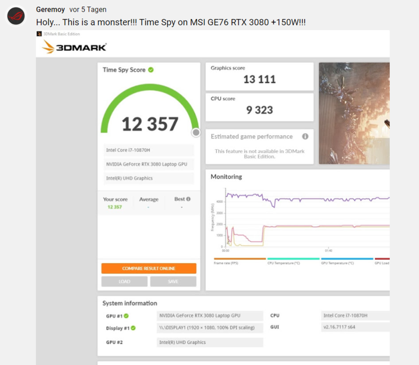 - Firestrike: 23.600 (Graphics: 30.761, Physics: 20.725, Combined: 9.300) (Intel i7-10870H)