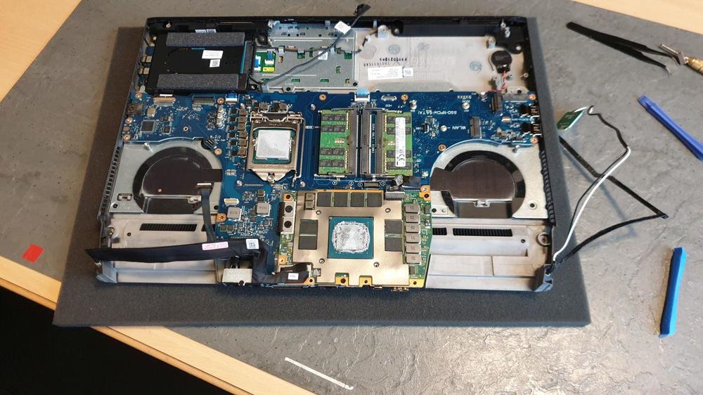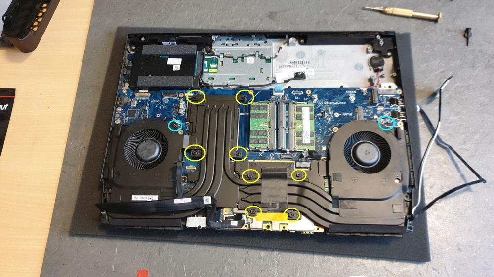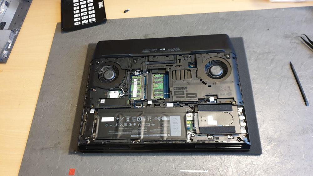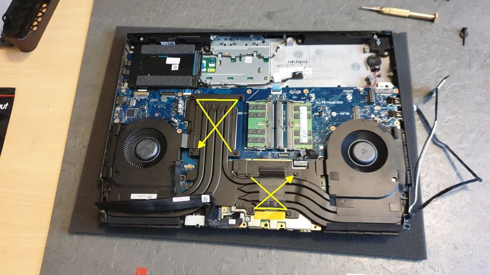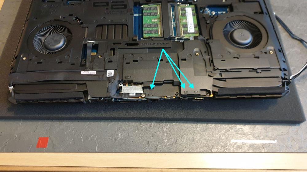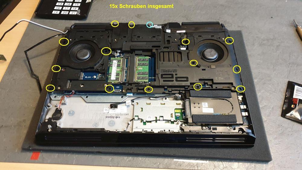 Wie immer, falls ihr es selber macht, ist das ganze alles auf eigenes Risiko. Ich übernehme keine Haftung oder Verantwortung. Vielmehr dient der Thread als Hilfestellung und Wissenserweiterung. Detaillierte Informationen zu den Sicherheitsbestimmungen findet ihr im Service-Manual Area 51m oder auf der Dell Homepage. Da ich nun schon öfter das Vergnügen hatte den Area51m zu repasten und wir hier im Forum noch kein offiziellen Repaste-Guide haben, wollte ich die Chance ergreifen und einige wichtige Informationen zum Repaste beim Area 51m zusammentragen. Dieser Repaste-Guide ist kein offizieller Guide, der vorschreibt wie man was zu machen hat, sondern zeigt eine Möglichkeit auf wie man so einen Repaste durchführen kann und zählt Empfehlungen auf, die auf meinen Repaste-Erfahrungen beruhen. Wie man den Repaste am Ende selbst an seinem eigenem Gerät durchführt, bleibt jedem selbst überlassen. Noch eine Anmerkung zur Vorgehensweise/ Darstellung im Repaste-Teil. An einigen Stellen werde ich Bilder teils doppelt posten. Ich möchte damit einfach mehrere Eindrücke und Sichtweisen von dem Repaste vermitteln und was einem im Detail erwartet. Es folgen auch einige Detailbilder wie beispielsweise von den Lüftern oder der GPU. So das man sich in dem Guide auch einige Bauteile in Ruhe angucken kann. 1. Das richtige Werkzeug Ohne gescheites Werkzeug sollte man so einen Repaste erst gar nicht anfangen. Meine Empfehlung für das passende Werkzeug ist wie immer das: Schraubendreher-Set von HAMA und iFixit Tool-Kit Das Schraubendreher-Set von Hama ist dahingehend zu empfehlen, weil es lange Bits hat, welche das iFixit-Tool-Kit leider nicht besitzt. Diese langen Bits erleichtern vor allem bei tiefen Löchern die Demontage, aber auch so hat man mit langen Bits mehr im Blick, da man nicht so viel vom PCB verdeckt. Ich empfehle auch, egal welcher Schraubendreher, immer einen Magneten an den Schraubendreher zu stecken. So bleiben die Schrauben immer schön am Schraubendreher. Bei mir schaut das wie folgt aus: 2. Die richtige Vorbereitung Mit ein paar kleinen Tricks kann man sich das Leben deutlich einfacher machen und Fehler vorbeugen. So wäre beispielsweise der Punkt der Organisation/ Sortierung zu erwähnen. Gerade wenn man noch nicht so viel Erfahrung hat, können einem die vielen unterschiedlichen Schrauben schnell durcheinander bringen oder man vergisst schnell mal eine. Eine sehr einfache Methode ist, die Schrauben vorher passend abzulegen und gegebenenfalls zu beschriften. Bei Notebooks, die ich nicht regelmäßig repaste sieht das wie folgt aus: Die Schale ist der Deckel aus dem iFixit-Toolkit, den ich beschriftet habe. Zusammen mit der Liste ist das praktisch idiotensicher. Ein weiterer Fehler, der durchaus in der Vorbereitung passieren kann, ist die richtige bzw. ausreichende Menge an Wärmeleitpaste da zu haben. CPU IHS und GPU DIE sind nicht gerade klein (beim Area 51m) und wenn man z. B. Kryonaut mit 1 Gramm kauft, kann das möglicherweise zu wenig sein und es gibt nicht schlimmeres als auf halben Wege des Repastes festzustellen, dass einem die WLP nicht reicht. Hier mal ein Vergleichsbild von zwei neu gekauften WLPs: (Kryonaut 1g vs. Noctua 3,5g) Insbesondere wenn man WLP-Tuben hat, wo man den Inhalt nicht sehen kann, ist das eine Überlegung in der Vorbereitung wert. Weitere selbstverständliche Punkte wie eine weiche Unterlage für das Notebook oder eine gute Ausleuchtung erwähne ich jetzt nicht extra. 3. Demontage-Hinweise Bei der Demontage orientiere ich mich an dem Service-Manual (Link ganz oben in der Beschreibung) und meiner Erfahrung. Ich empfehle immer nur die Schrauben, die Stecker, die Bauteile zu lösen, die essentiell nötig sind und den Repaste durchzuführen, auch wenn das Service-Manual an der ein oder anderen Stelle eine andere Vorgehensweise empfiehlt. Wenn man meint seine HDD, RAM oder CMOS-Batterie ausbauen zu müssen, muss man ggfs. damit rechnen, dass das Notebook nach dem Repaste evtl. zicken macht. Zu erwähnen wäre da z.B. CMOS-Batterie ab = BIOS Reset, Arbeitsspeicher raus = Meldung im ePSA beim ersten booten. Ist kein zwingendes Muss, aber auch nicht auszuschließen. Stecker lösen ist auch ein wichtiges Thema. Dell empfiehlt hier an der Lasche bzw. dem Kabel selber zu ziehen, um das Kabel aus dem Stecker herauszulösen (außer Flachbandkabel). Ich empfehle es keineswegs. Besonders dann nicht, wenn die Kabel viele kleine Litzen haben. Einmal falsch gezogen und schon hat man so ein Kabel schnell beschädigt und selber reparieren ist nahe zu unmöglich, da es einfach viel zu klein ist. Daher gleich das Risiko vermeiden und immer versuchen direkt am Stecker zu ziehen. Meistens haben die an den äußeren Enden kleine Verbreiterungen an dem den Stecker hochziehen kann. Ein weiterer leicht unterschätzter Punkt ist das Arbeiten mit Pinzette und anderen metallischen Werkzeugen. Nach Möglichkeit immer, da wo man kann, Plastik-Tools oder Finger(nägel) benutzen. Metall leitet sehr gut und ist vergleichsweise hart. Wenn man platinen-nah arbeitet und abrutscht ist es zumindest nicht ausgeschlossen, dass man sein Notebook dabei beschädigt. Entweder, weil man sich mit dem harten Metallwerkzeug Kondis oder andere SMD-Bauteile runterreißt oder durch das Metall einen Kurzschluss auf dem PCB verursacht. Selbst nach einem Powerdrain kann man nie 100%ig sicher sein, dass alle Kondensatoren vollständig entladen sind. Ich würde das Risiko nicht als sonderlich hoch einstufen, trotzdem verfahre ich hier nach der gleichen Empfehlung wie bei dem Lösen der nur notwendigen Schrauben. Einfach jedes Risiko, jedes Potential für Fehler, von vornherein, so minimal wie möglich halten. Dann hat man schon mal eine solide Basis für ein erfolgreichen Repaste. Als letzten Punkt wollte ich noch eine Sache erwähnen, die eigentlich völlig logisch erscheint, aber doch schnell mal falsch gemacht werden kann. Normalerweise (zu 95%) lässt sich jedes Bautteil ohne viel Widerstand herausnehm