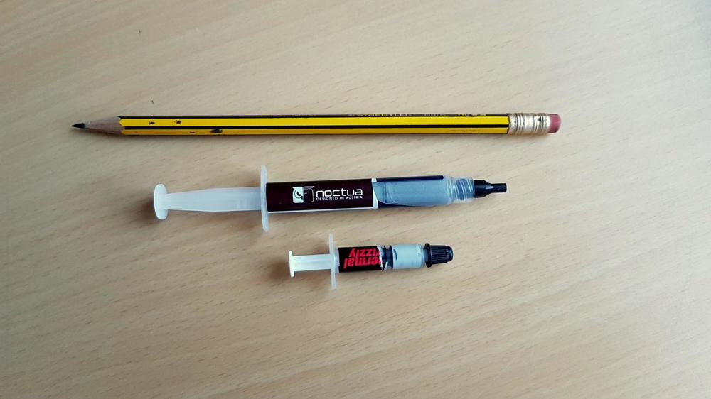 Moin zusammen, wie ihr sicher alle schon am eigenen Leib erfahren musstet, kann die Frage: "Was ist eigentlich die beste Wärmeleitpaste?" zu einem Kleinkrieg der Meinungen führen. Häufig kommen dabei Aussagen wie "Also bei mir läuft es seit dem 3°C kühler!" oder "Die Herstellerangaben stimmen nicht!" auf. Ich habe mir in den letzten zwei Wochen das Ziel gesetzt, mich mal wissenschaftlich mit dem Thema zu beschäftigen und, so hoffe ich, endlich Klarheit in diese Thematik zu bringen. Zunächst zu den oft gehörten und hier frei zitierten Aussagen: "Also bei mir läuft es seit dem 3°C kühler!" mag bei dem Autor stimmen, trägt aber keinerlei Aussagekraft für andere Systeme. Tatsächliche Abwärme, Lufttemperatur und Luftfeuchtigkeit, Nutzungsverhalten, Gehäuse, Kühloberfläche und Wärmeleitwege haben einen viel zu großen Einfluss. Selbst die Schlussfolgerung "besser als die alte Paste" ist mit Vorsicht zu genießen. Pasten altern viel zu unterschiedlich und auch die Temperatur, bei der sie getestet werden ist maßgeblich. Dazu aber im nächsten Absatz mehr. Sehr verwundert hat mich die Aussage: "Die Herstellerangaben stimmen nicht!". Ich konnte mir kaum vorstellen, dass die Hersteller auf ihren Verpackungen lügen. Viel zu groß ist die Gefahr sich damit selbst sein "Image-Grab" zu schaufeln. Bei der Recherche ist mir ein wesentlicher Punkt aufgefallen: Es steht nie dabei, in welchem Temperaturbereich der Wärmeleitwert gemessen wurde, oder bei welcher Schichtstärke. Die Wärmeleitfähigkeit von Flüssigkeiten (mit einem flüchtigen Bestandteil) nimmt mit steigender Temperatur ab. Das hängt mit dem Phasenverhalten der einzelnen Bestandteile der Paste zusammen. Wurde vom Hersteller also bei einer sehr geringen Temperatur gemessen, kann das die Wärmeleitfähigkeit positiv beeinflussen. Auch die Schichtdicke ist nicht uninteressant. Der Wärmeübergang an den Oberflächen der Paste ist schlechter als im Inneren. Also kann eine Dicke Schicht die Werte des Herstellers auch schönen. Aber Vorsicht! Das bedeutet nicht, dass eine dicke Schicht in PC besser ist. So oder so ist die Leitfähigkeit der Paste schlechter als die von Kupfer oder Aluminium. Daher sollte die Schicht natürlich IMMER so dünn wie möglich sein. Wie wir sehen konnten gibt es einige Möglichkeiten für die Hersteller die Ergebnisse zu beeinflussen. Doch wie bekommt man jetzt heraus welche Paste für welchen Anwendungsfall die beste ist? Zu diesem Zwecke habe ich mit einen Versuch überlegt. Wen nur die Ergebnisse interessieren, der kann weiter unten gucken. Für die technisch Interessierten unter euch (ich tippe auf die Mehrheit) habe ich versucht mein Vorgehen (hoffentlich verständlich) zusammen zu tragen. Grundaufbau und Idee: Der Versuch besteht aus einem leistungsstarken Labornetzteil, einem Steckbrett mit Arduino zur Datenverarbeitung, einem Laptop zur Anpassung der Prüfparameter, einem Lüfter zum schnelleren Abkühlen nach dem Versuch und.... dem eigentlichen Experiment. Das besteht aus zwei identischen Aluminiumkörpern mit Sensoren und Heizelementen. Beide Körper haben eine sehr ebene Prüffläche auf die die Wärmeleitpaste aufgetragen wird. Mit einer kräftigen Kunststoffklemme wird der Anpressdruck erzeugt. Die beiden Blöcke habe ich aus Aluminium gedreht und gefräst. Sie haben genau die gleichen Abmaße, was bei der Berechnung der thermischen Kapazität wichtig wird. Außerdem habe ich die Messoberfläche sehr fein geschlichtet, um eine spiegelnd glatte und Ebene Auftragsfläche für die Paste zu erzeugen. Anschließend habe ich den ersten Block mit zwei Keramikheizelementen ausgestattet. Diese eigenen sich besonders gut, da sie die Wärme über einen elektrischen Widerstand erzeugen und somit einen Wirkungsgrad von fast 100% haben. Jedes Element hat ca. 40W Wärmeleistung. Außerdem habe ich einen Temperaturfühler (NTC-Thermistor mit 100k) nur einen Millimeter hinter der Messfläche in der Mitte angebracht. Der zweite Block bekam nur einen Sensor und keine Heizelemente. Die Idee hinter dem Aufbau: Wenn der erste Block erwärmt wird beginnt ein Wärmestrom durch die Prüffläche und die Wärmeleitpaste in den zweiten Block zu fließen. Dieser Wärmestrom ist, in Abhängigkeit der Schichtdicke, der Auflagefläche und der Temperaturdifferenz, begrenzt durch den Wärmeleitwert zwischen den Prüfflächen. Thermodynamik 🤮 Ich muss zugeben, dass Thermodynamik nicht mein Lieblingsfach im Studium war. Jedoch ist das hier ein relativ einfacher Zusammenhang und somit nicht ganz so sauer, wie es meiner Überschrift aufstößt. Für die Berechnung des Wärmeleitwerts benötigen wir folgende Größen: Den Wärmefluss Qp [W] Den Abstand zwischen den Messflächen l [m] Die Fläche der Messflächen A [m²] Die Temperaturdifferenz der Messflächen dT [°K] Gesucht ist der Wärmeleitwert lamda [W/m*K] = [W*m/m²*K]. Nun ist leider die Wärmeleistung der Heizelemente nicht gleich dem Wärmefluss zwischen den Blöcken. Jeder kennt dieses Phänomen aus dem Alltag. Stellt man einen Topf auf den Herd, so dauert es eine Weile, bis er heiß genug zum kochen ist. Das liegt an der Wärmekapazität. Um das zu erklären ist es zunächst wichtig zu verstehen, dass Wärme und Temperatur nicht die gleichen Dinge sind. Wärme ist eine Energieform, weshalb ihre Einheit auch Joule oder Wattsekunde ist - daher auch der Wärmefluss in Watt! Die Temperatur gibt an, wie viel Energie in Abhängigkeit der Wärmekapazität ein einer bestimmten Menge eines bestimmten Stoffes enthalten ist. Das ist sehr kompliziert ausgedrückt, was im Grunde auch jeder von zuhause kennt. Man braucht mehr Energie um ein kg Wasser zu erhitzen als ein kg Luft. Die Einheit der Wärmekapazität ist J / kg * K (Joule pro Kilogramm mal Kelvin). Aluminium besitzt eine Wärmekapazität von 900 J/kg*K. Da ein Joule gleich einer Wattsekunde ist, kann man sagen, dass man 900W braucht um 1kg Alu um ein Grad Kelvin in einer Sekunde zu erwärmen. Werden nun beim