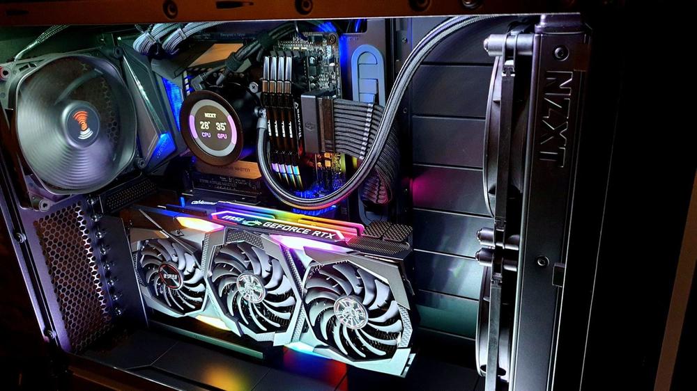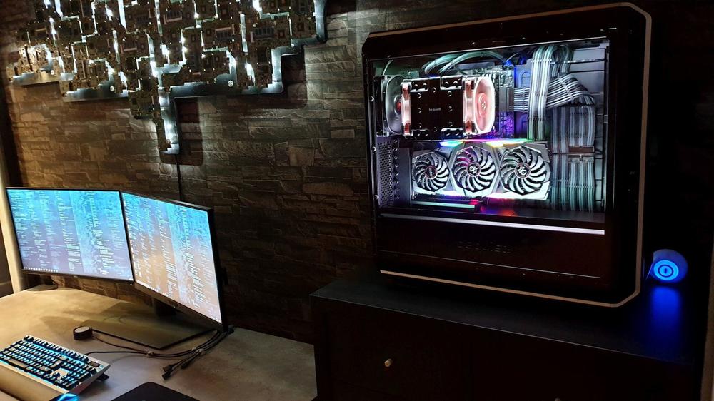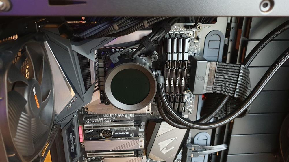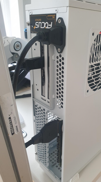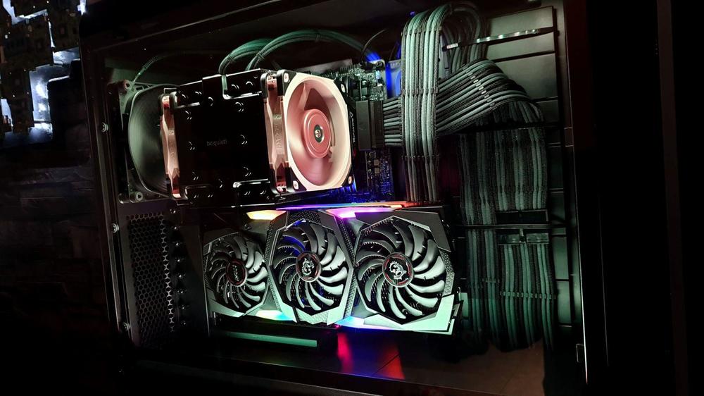 Puuh, weiß nicht. Vielleicht Skalierung oder so. Wie sieht's mit'm anderen Browser aus? Ich baue ja häufiger PCs zusammen und kenne daher das ganze Namens-Chaos von USB. Orientiere dich nicht so stark dran, was die Hersteller für Bezeichnungen ihrer I/O Panels geben, die sind nämlich auch nicht immer richtig. Ist aber eigentlich egal, weil sind eh alles die gleichen Kabel, die ins Mainboard münden. Wichtiger ist welche Anschlüsse dein Mainboard bietet. Ich vermute mal, dass du USB 3.1 Typ C Gen. 2 meinst. (...was für'n Name). Ist halt der schnellste Anschluss für USB am Front-Panel und bei heutigen Gehäuse Standard. Ja gut, zum einen kann der Fuma2 nicht wirklich laut^^ und zum anderen hast du ein relativ geschlossenes Case. Das fängt schon ein wenig Schall ab, wobei deine eingesetzten Lüfter und das alles bis zu einem gewissen Grad auch leise bleibt. Sind halt keine Blower-Fans oder so ein Blödsinn drin. Kleiner Tipp: Falls du mal ein Repaste machst, dreh den Fuma besser um. Er ist mit seinen gegenläufigen Lüftern und den Heatsink-Lamellen für die andere Strömungsrichtung konzipiert. Gut möglich, dass er dann effektiver kühlt. Das stimmt. Viel zu teuer von Corsair die Dinger. Wenn du Premium möchtest, bestellst du eh bei Cable-Mod passend in deinen Farben, Längen und für dein Netzteil oder du nimmst die Alternativen von Amazon und Co. (Alternative1, Alternative2). Hab ich auch schon öfter gemacht und sind von der Qualität voll in Ordnung. Musst halt gucken welches Sleeve-Material (PET oder Paracord) du möchtest. Da kann ich dir 4 Sachen hierfür wärmsten empfehlen. Hat sich bei mir bislang wunderbar bewährt. - Kabelschlauch groß - Kabelschlauch klein - Kabelbox - Klettbänder So sieht das ganze dann bei mir aus: Dann fang ich mal mit meiner Bude an, auch wenn die Fotos nicht mehr ganz so aktuell sind. Komponentenliste: Case: BeQuiet Dark Base Pro 900 Rev.2 Mainboard: Gigabyte Z390 Aorus Master CPU: Intel Core i9-9900KS CPU-Kühler: BeQuiet Dark Rock Pro 4 (inkl. 2 NF-A12)* GPU: MSI RTX 2080 Super Gaming X Trio GPU Mount: CableMod Vertical GPU Bracket RAM: 4x 8GB G.Skill Ripjaws V (Samsung B-Die) PCIe m.2 SSD: 3x Samsung 970 Evo+ 500GB SATA SSD: 2x Samsung 860 Evo 500GB PSU: Seasonic Focus Gold 80+ 750w Air-Intake: 3x BeQuiet Silent Wings3 140mm PWM* Air-Exhaust: 1x BeQuiet Silent Wings3 140mm Highspeed PWM Extra: Gesleevte Kabelverlängerungen* Extra: Cooler Master 24-Pin ATX 90° Grad Adapter Monitor1: Gigabyte Aorus AD27QD (2560 x 1440p) 144Hz Monitor2: Dell P2720D (2560 x 1440p) Monitorständer: Dell MDS19 Tastatur: Alienware AW768 + Palmrest AW168 Maus: Logitech M720 Sound: Bose Companion 50 Headset: Logitech G935 (Wireless) Stuhl: Noblechairs EPIC & ICON * Teile wurden mittlerweile geändert Wahl der Komponenten: Mit dem Setup bin ich vollstens zufrieden, auch wenn ich mittlerweile einiges geändert habe und auch noch einiges in Planung ist, dazu aber gleich mehr. Das Aorus Master bot zu dem damaligen Zeitpunkt in der Preisklasse (280 - 320€) die beste Option für mich. 3x m.2 PCIe SSD, stärkstes VRM-Layout, beste VRM Kühlung, Dual Bios, Cmos-Button, 8x Fan/ Pumpe Anschlüsse, verstärkte Stromschlüsse und und und. Da Z390 Chipsatz, kam dementsprechend nur Intel in Frage. Logischerweise konnte ich in ein High-End Board keine Mittelklasse-CPU reinstecken. Also kam vorerst ein 9900K rein. Da man mit so einem Mainboard gefühlt unendlich Möglichkeiten hat, die Spannung seiner CPU einzustellen, kam schnell der Wunsch auf, eine selektierte CPU haben zu möchten damit ich vom Strom her deutlich weiter runter gehen kann. Also kaufte ich mir den KS, der natürlich auch für OC besser eignet. Strom- und damit temperaturtechnisch ging hier dann noch mal deutlich was. Ich betreibe meine CPU mit dem Minimum an Strom, den ich zum Zocken brauche. Prime95 überlebt er mit der Einstellung nicht, aber bei Prime ist die Last ist so oder so unrealistisch hoch (Gaming). Ich weiß, viele testen mit Prime95 und wollen ein absolut stabiles System und betreiben ihr System dauerhaft mit der Spannung, die den Worst-Case überlegt. Ich habe hierfür einfach ein zweites Setting, was ich während des laufenden Betrieb einstellen kann. Wenn's mal ein Bluescreen gibt, drehe ich 0,05mV auf und spiel weiter. Bislang hält aber der Sweetspot noch ganz gut durch. Ich glaub, dieses Jahr noch kein Mal abgestürzt. Für's Video rendern reicht's jedoch nicht ganz. Hintergrund der Geschichte ist: weniger Strom --> weniger Abwärme --> leiseres System. So sehen die Temperaturen nach 2h Spielzeit (AC Odyssey) mit dem Setting und dem Dark Rock aus: Als GPU hatte ich zunächst die Gigabyte RTX 2080 Aorus, da ich bereits mit dem Mainboard und dem Monitor gute Erfahrungen mit Gigabyte gemacht hatte. Jedoch habe ich diese Karte relativ schnell zurückgeschickt. Aufgrund der, im Vergleich zu den anderen, kleinen Größe war die Passiv-Kühlleistung nicht so dolle und die Kühlleistung allgemein nicht so. Also gab ich sie zurück und bestellte mir im Austausch die MSI Gaming X Trio, die so ziemlich die größte 2080 ist. Mit der bin ich "super" zufrieden, weil sie auch im Gaming-Betrieb sehr leise ist. Außerdem gefällt sie mir optisch sehr gut. Einziger Nachteil, bei so einer großen Karte kann die vertikale Ausrichtung mit einem großen Luftkühler schnell kollidieren. Also mit'm Noctua NH-D15 passt es so nicht. Updates: Seit letzter Woche ist nach langem hin und her nun auch eine AIO in mein Case eingezogen. Zum Einsatz kommt die NZXT Kraken Z63. Ich betreibe den Radiator in einer Pull-Push Konfiguration mit zwei Actic P14 Lüfter als Push und zwei Silent Wings 3 als Pull. Den Stecker der AIO habe ich etwas umgemodelt, weil mir dort zu viel Kabel dran waren. Außerdem waren sie nicht gesleevt. Zusätzlich habe ich mir auch Stecker für die GPU gebastelt damit man keine Kabel mehr sieht. Die gesleevten Kabel habe auch ausgetauscht. Hier mal einige Bilder: Die Kühlleistung ist mit der AIO zieml