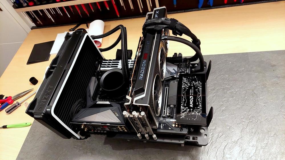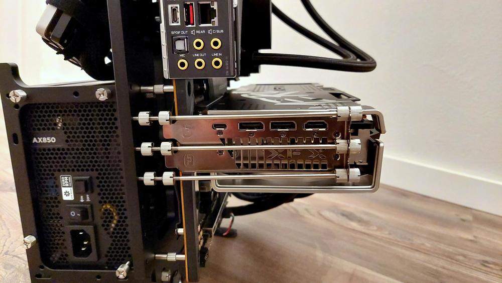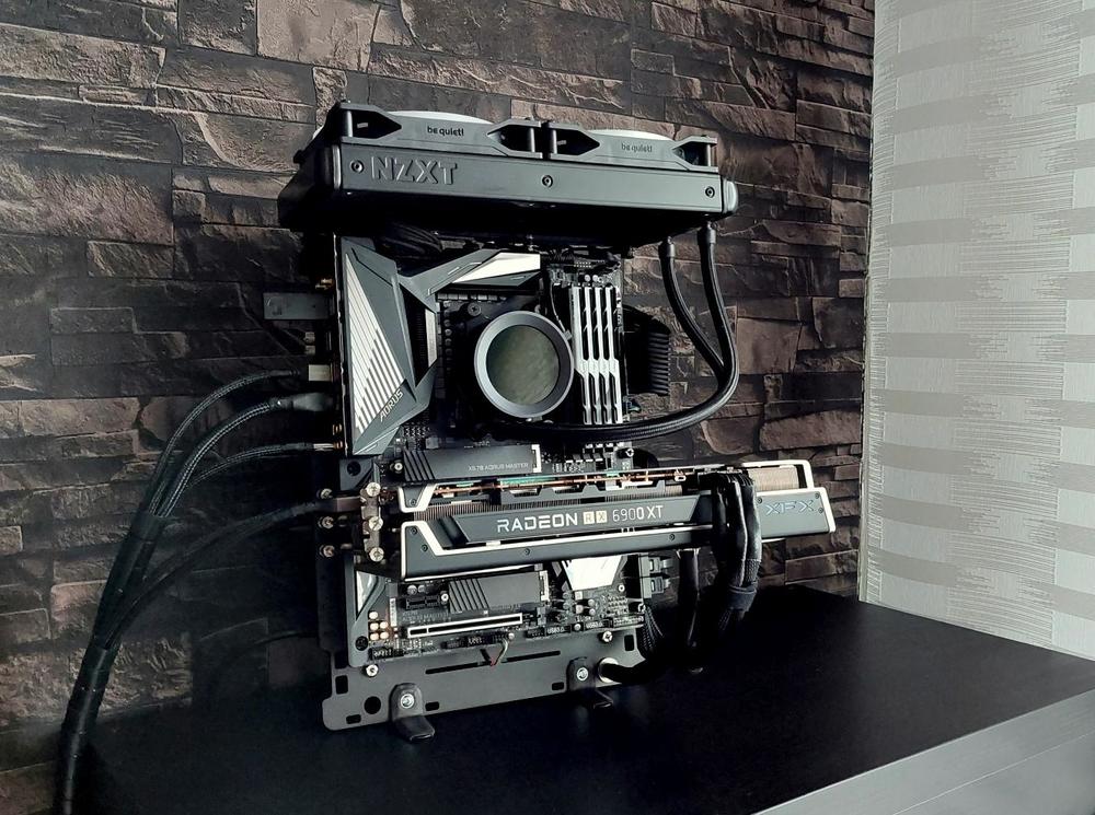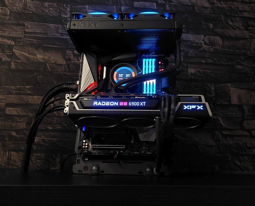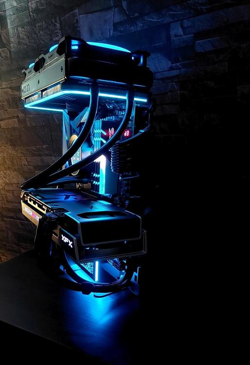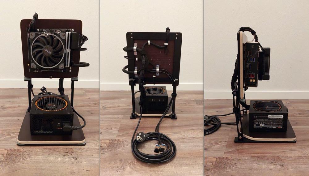 Zum einen mit den drei Streben links, die erstaunlicher mehr Halt geben als gedacht und zum anderem mit einem selbst angefertigtem Anti-Sag-Mount. Hab halt drei Streben genommen, um die maximale Stabilität zu erreichen. Ich wusste aber schon vor dem Kauf, dass eine Lösung gegen GPU-Sag bei diesem "Gehäuse" definitiv ein Problem werden wird. Insbesondere bei der langen und schweren Karte, die ich habe. Letztendlich dachte ich mir, dass mir schon eine passende Lösung einfallen wird, wenn ich das Case zu Hause habe. Für den Anti-Sag-Mount habe ich dann ein 12mm dickes Aluminiumrohr genommen, es auf den passenden Winkel gebogen, ein Gewinde oben und unten reingeschnitten und schwarz lackiert. Das Teil ist so stabil, das hält die GPU mit Leichtigkeit alleine. Bin jedenfalls sehr zufrieden damit. Auch Standfüße gegen das nach vorne Kippen musste ich mir anfertigen. Das war jetzt aber weniger ein Problem. Hab jetzt die Tage noch ein wenig Beleuchtung montiert und bin soweit jetzt erstmal fertig. Bin sehr zufrieden mit dem Gehäuse. Ist einfach mal was anderes und nimmt nur sehr wenig Platz ein. Leise ist es auch, da kaum Lüfter verbaut sind.6 Punkte