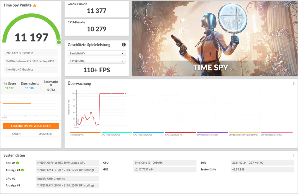 Servus aus dem Allgäu, da mir da Forum und ihr als Mitglieder bisher viel wichtige Infos geschenkt habt wollte ich jetzt meine Erfahrung und Werte ebenfalls mitteilen. Vieleicht hilft es jemandem bei der Entscheidung ob m17 oder nicht. Meine Werte als Bilder: mit der Konfig i9 und RTX 3070 bekommt man das 240 Watt Netzteil geliefert der i9, wie im geteilten Benchmark, lief mit UV und veränderten Turbo Ratio Limits in Throttlestop die GPU wurde mit +100 Core und +200 Memory im MSI Afterburner betrieben die Stabilität des Systems wurde mit AIDA64 Stresstest und 3dMark Dauertest gestern getestet und es lief ohne Probleme es wurden die Standardtreiber von Dell vom Auslieferungszustand verwendet Für die Lüfter nutze ich die "Glatte Linie" Funktion im ACC ab 70 bis 100 Grad Die GPU wird aber nur zum Spielen mit OC betrieben, im Alltag läuft sie mit den Standardwerten das Laptop steht auf einer IcyBox Halterung und hängt an einem VESA400 Arm in der Luft Meine Erfahrung: Ich hatte bisher ein Surface Book 2 15 und der Lüfter war fast genau so laut nach meinem Empfinden die pfeifenden, hundpfeife-ähnlichen, Lüftergeräusche gibt es bei mir definitiv nicht Die Tastatur ist super, ich mag sie. Sie ist weicher im Druck wie eine Logi MX Keys oder der MS Surface Tastatur die Verarbeitung ist einem Premiumprodukt angemessen im Idle ist der Lüfter kaum wahrzunehmen oder ganz aus das 4k Display ist super in der Bildqualität UV ist beim i9 nötig wenn man mehr Performance haben will Wieso i9 und 3070? Es wird, neben gelegentlichem Spielen, viel für Content Creation für Fotos und Texte genutzt sowie auch öfters bewegt. Daher sind kleineres Netzteil, 17 Zoll und weniger Grafikpower ein guter Mittelweg gewesen. Falls jemand noch mehr Werte braucht oder was wissen will einfach Fragen. Ich melde mich dann bei euch.6 Punkte