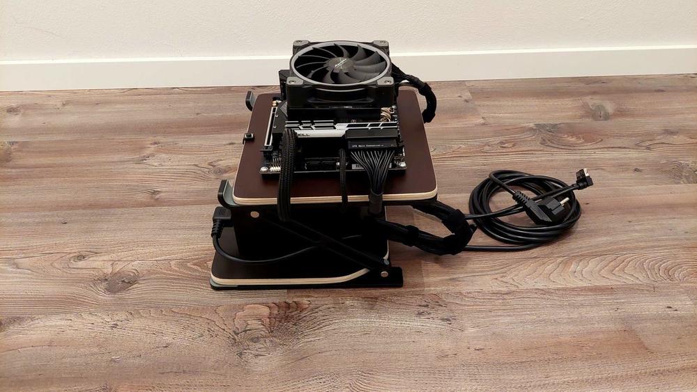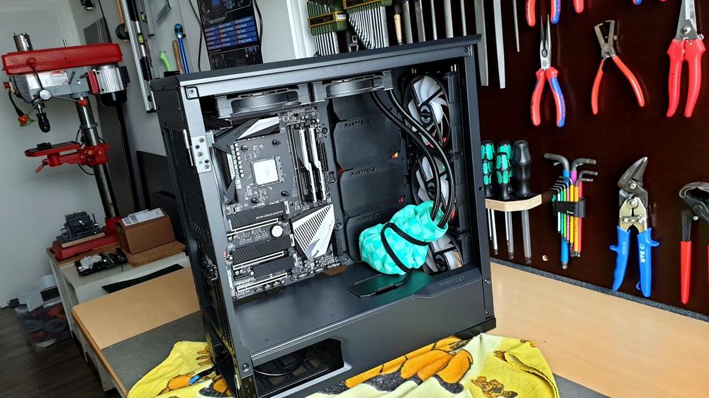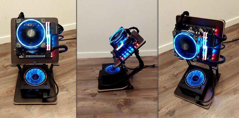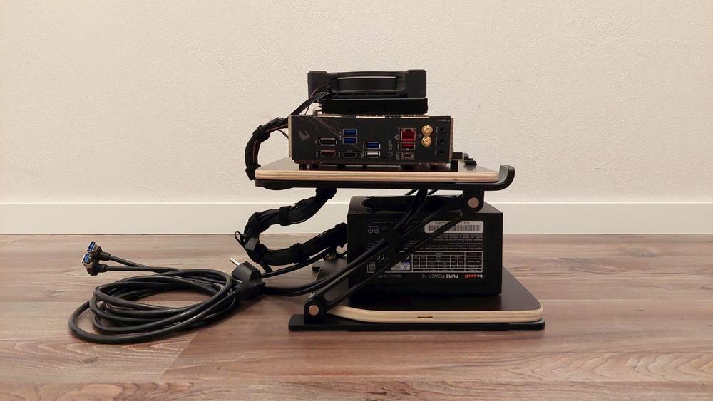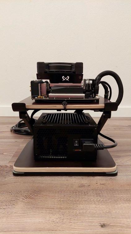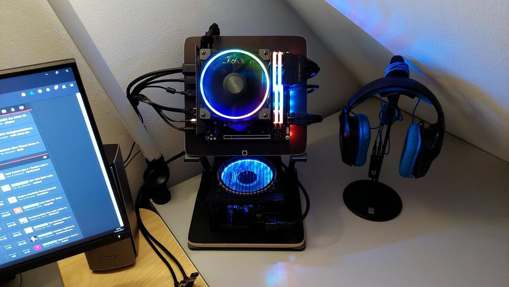 Hab mir für's Büro ein kleines Upgrade gegönnt. Folgende Specs sind verbaut: - AMD Ryzen-5 5600G (mit iGPU) - B550i Aorus Pro AX - Scythe Big Shuriken 3 (Low-Profil Kühler) - 16GB G.Skill Trident Z (2x 8GB) @ 3.800 MHz CL16-16-16-32 (Sam B-Die) - 2x m.2 NVMe Samsung 970 EvoPlus 500GB - 400w BeQuiet Pure Power 10 (80+ Gold) (war über) - Beleuchtung: Wingboost 3 aRGB Lüfter & Phantkes Halo für PSU - Zweckentfremdetes offenes DIY-Case Da ich die Hardware gerne sichtbar haben wollte, habe ich diesmal ein bewegliches und offenes DIY-Case gebastelt. Anfangs wollte ich ein Testbench (für ITX) oder sowas ähnliches holen, aber das fand ich einfach viel zu teuer. Das DIY-Case hat mich nur 28 € und wenig Bastel-Zeit gekostet. Das "Gehäuse" kann man ganz nach seinem Belieben einstellen, da die Scharniere alle beweglich sind: Ein wenig RGB durfte auch nicht fehlen, weswegen der Wingboost Lüfter noch oben drauf kam und ins Netzteil habe ich ein Halo-Ring verbaut. Normalerweise gehören die oben drauf, aber das sah bisschen unschön aus. Die Temperaturen sind natürlich Top und der 5600G ist wirklich fix unterwegs. Also die neuen APUs von AMD sind schon nicht übel. Wenn man Lust hat, könnte man eine GPU anschließen und hätte direkt ein fertiges Gaming-Rig.5 Punkte