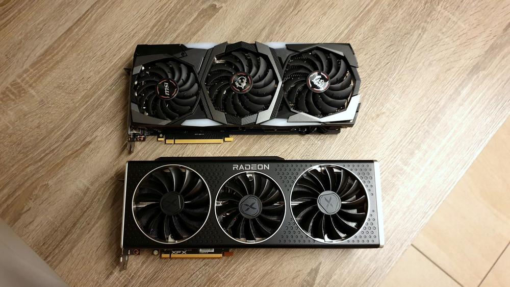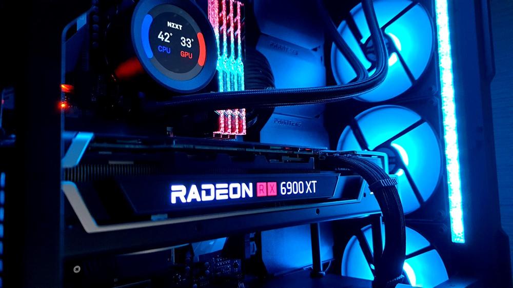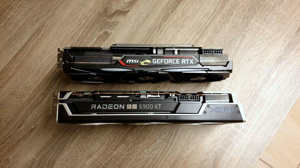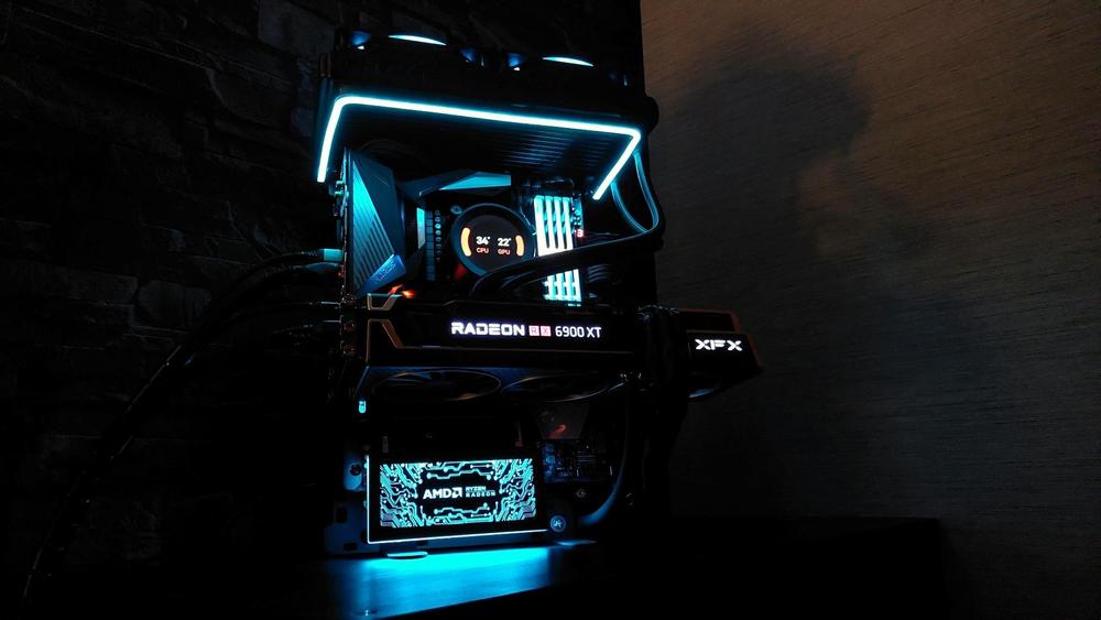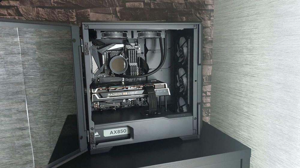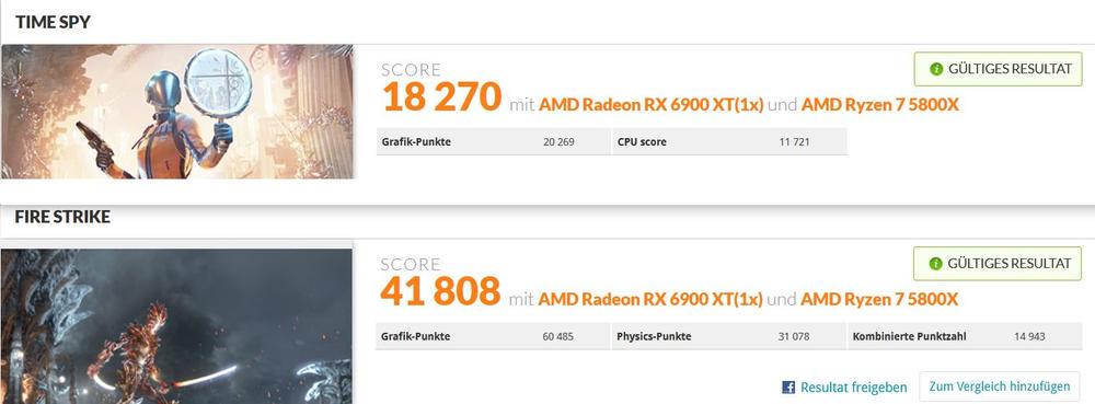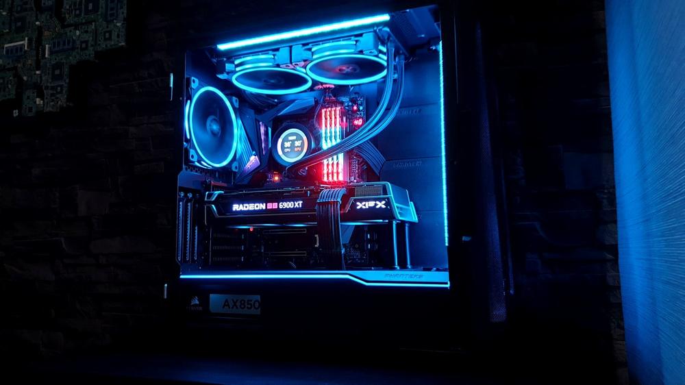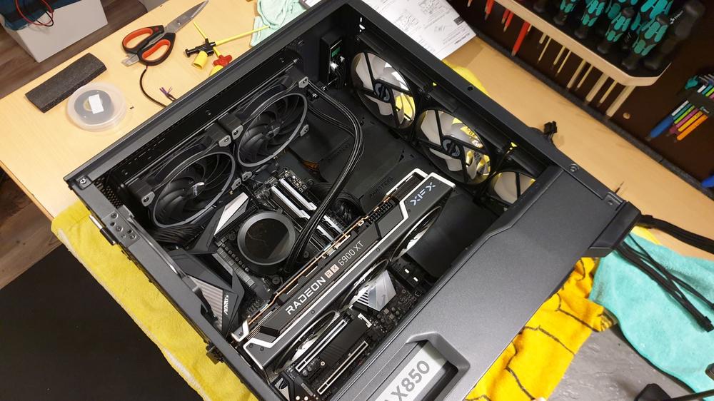 Wie ich es bereits an der ein oder andere Stelle angedeutet habe, habe ich mir ein neues System gebaut. Die Möglichkeit hat sich ergeben, da mein Arbeitskollege auf der Suche nach einem neuen PC war und mir entsprechend noch ein gutes Angebot für mein altes System gemacht hat. Eigentlich war geplant, dass ich mir alle Teile wieder direkt neu zusammenkaufe. Zufälligerweise entdeckte ich bei der GPU-Suche aber ein Komplettsystem, was zu 80% die Teile verbaut hatte, die ich neu kaufen wollte. Nach etlichen Telefonaten und Kalkulationen entschied ich mich dann für das Komplettsystem (nur 3 Wochen alt) und holte es ab. Anschließend verbrachte ich zwei Abende in meiner Werkstatt und machte das neue System nach meinen Vorstellungen fertig, zumindest so weit ich das konnte. Verbaut wurde Folgendes: Case: Phanteks Eclipse P500A D-RGB Board: Gigabyte X570 Aorus Master CPU: AMD Ryzen 7 5800X GPU: XFX RX 6900XT Mer 319 BLACK RAM: 4x 8GB G.Skill Neo (Sam B-Die) SSD: 2x Samsung 980 Pro (PCIe 4.0) Cooler: NZXT Kraken Z63 AIO PSU: Corsair AX850 (Titanium) Zubehör: schwarz gesleevte Kabel etc. Monitor: MSI Optix MAG27QRF-QD (165Hz IPS) (bestellt) Hier mal ein Vergleich der neuen GPU mit der alten: Die MSI war ja schon mit einer der größten damals, aber die XFX ist noch mal einen Tick länger und schwerer. Die Verarbeitung der Karte ist absolut Top. Rahmen, Frontcover, Backplate etc. ist alles aus Metall. Sieht und fühlt sich alles sehr hochwertig an. Hier mal einige Fotos vom Zusammenbau: Kabelmanagement darf natürlich auch nicht fehlen. So schaut das System am Tag aus: (wenn der PC aus ist) und so bei Nacht, wenn er an ist: Natürlich habe ich schon das ein oder andere umgebastelt, aber dazu äußere ich mich im Detail dann in einem anderen Beitrag. Ich bin aber noch lange nicht fertig. Einiges ist bereits bestellt und unterwegs. Dann zu den Benchmarks.... Ehrlich gesagt, habe ich noch nicht wirklich viel getestet und ausprobiert. Diese ganze AMD Sache ist für mich noch ein wenig neu und ich muss entsprechend viel Zeit investieren, um das optimale Setting zu finden. Zumindest habe ich jetzt mal einen Firestrike und Timespy Run gemacht. Anfangs natürlich Stock und jetzt mit bisschen UV und OC, wobei der Unterschied jetzt nicht so wirklich groß ausfällt. CPU läuft undervoltet mit dem Curve-Optimizier bei einem Offset von -19 und +50 MHz. GPU lief bisschen im OC. +100 Takt + 50 Mem. Gut möglich, dass mein Setting noch nicht wirklich gut ist. Daher nur vorläufige Ergebnisse: P.S.: GPU genehmigt sich maximal 330w mit PL +15%. Sonst sind's mein ich 280w. Takt läuft irgendwo bei 2.600 Mhz, hab die Karte aber noch nicht ausgefahren. Time Spy Link: http://www.3dmark.com/spy/19225522 Firestrike Link: http://www.3dmark.com/fs/252062765 Punkte