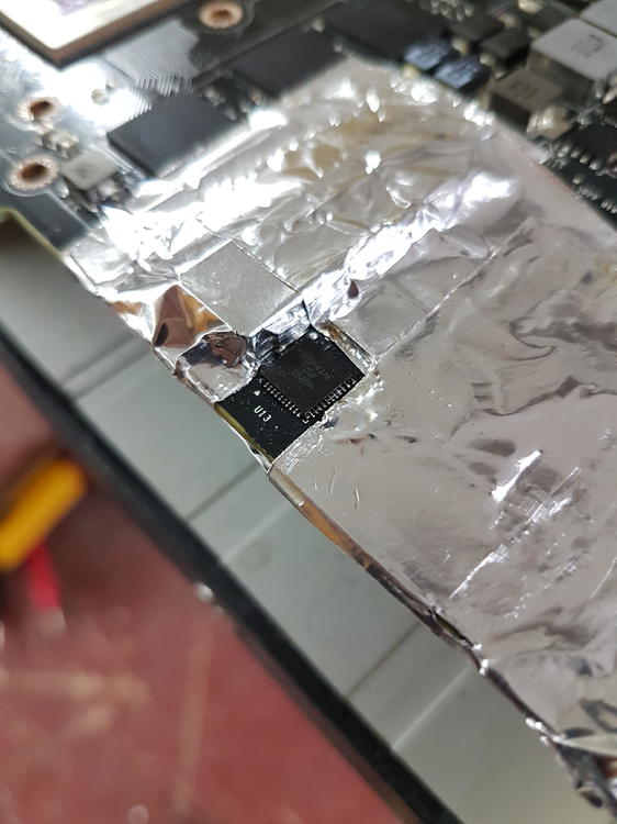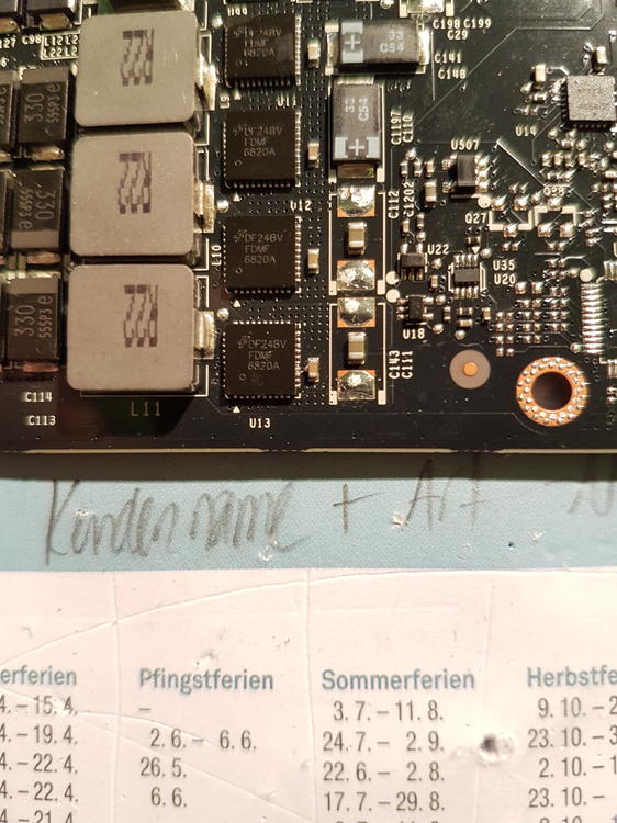 Die Titan lebt wieder! Es war tatsächlich ein Kurzschluss im 8Pin Stecker. Ohne Hilfe konnte ich das nur bis zu den unteren vier Mosfets nachverfolgen und wusste dann nicht weiter. Mehr durch Zufall habe ich dann ein Video gefunden, in dem jemand einen Mosfet auf einer EVGA 980 TI tauscht. Die vom PCB ziemlich identisch ist mit meiner Titan X. Das Video war sehr hilfreich (wenn auch sehr verwackelt), da dort erklärt wird, wie man herausfinden kann, welcher Mosfet schuld ist. Nach dem ich den Mosfet ausgelötet hatte, war der Kurzschluss schonmal weg. Den neuen Mosfet habe ich bei Digikey bestellt und gestern eingelötet. Nachdem ich nochmal überprüft habe, dass ich keinen Kurzschluss verursacht habe konnte ich die Karte testen. Sofort kam ein Bild - jedoch ging der PC aus, sobald ich einen Benchmark gestartet habe. Die Phase an der ich gearbeitet hab startete nicht. Ein paar der winzigen Kontakte rings um den Mosfet hatten sich beim Löten nicht richtig verbunden. Ich habe den Lötprozess bestimmt 20 Mal wiederholt, bis heute endlich die Karte stabil durch den Benchmark lief. Eine längere Zeit im Benchmark und eine kleine Runde Red Dead Redemption 2 später läuft die Karte immer noch ohne Probleme. Hier kann man beim untersten Mosfet Lötzinn an der Seite sehen. Das ist ein Indiz dafür, dass das der defekte Baustein ist. Durch das erhitzen beim Kurzschluss ist das Lot flüssig geworden und an der Seite ausgetreten. (Erklärung aus dem Video) Hier habe ich den Bereich um den defekten Mosfet abgeklebt, um keine anderen Teile mit abzulöten. Bei meinem Mosfet konnte man auch wie im Video den Kurzschluss zwischen zwei der großen Pads auf der Unterseite messen. Und hier haben wir den neuen Mosfet.6 Punkte