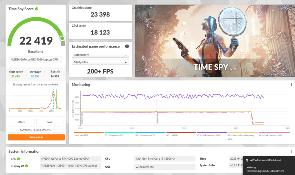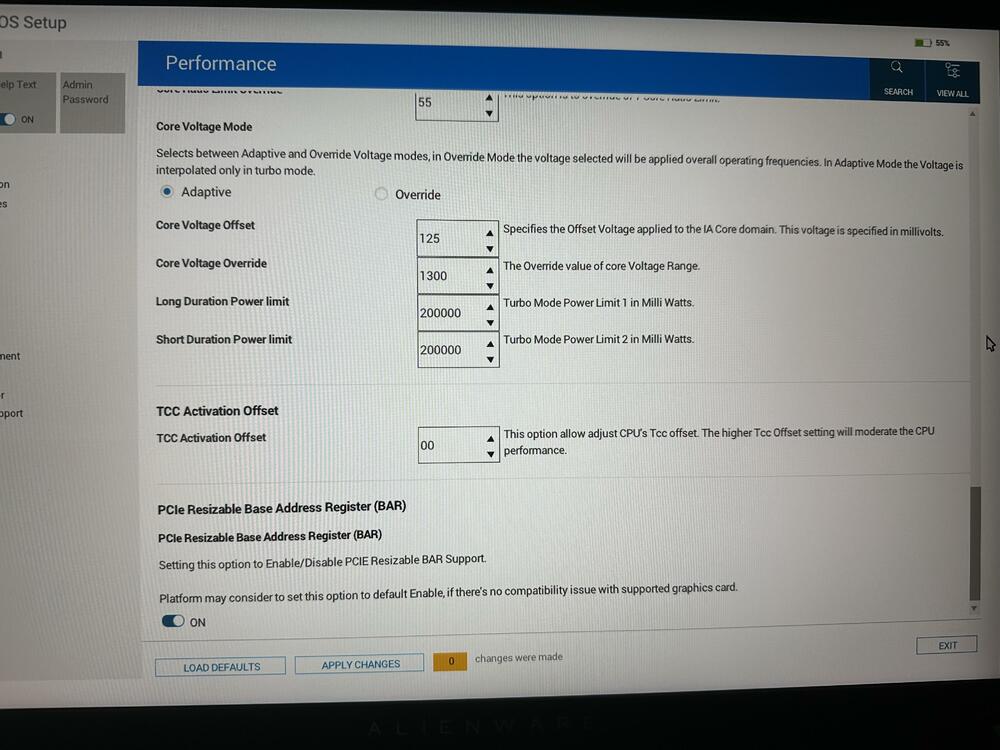 So sieht das unter performance im BIOS bei mir aus Hier noch mein Score mit den Settings von oben und im Overdrive Modus (AWCC). Bitte beachte aber, das ich komplett auf richtiges Liquid Metal gewechselt habe auf CPU und GPU. Hier noch der Score mit dem Performance/Leistung Modus im AWCC: Hier noch ein TS mit zusätzlich 250/1000Mhz OC auf GPU:5 Punkte