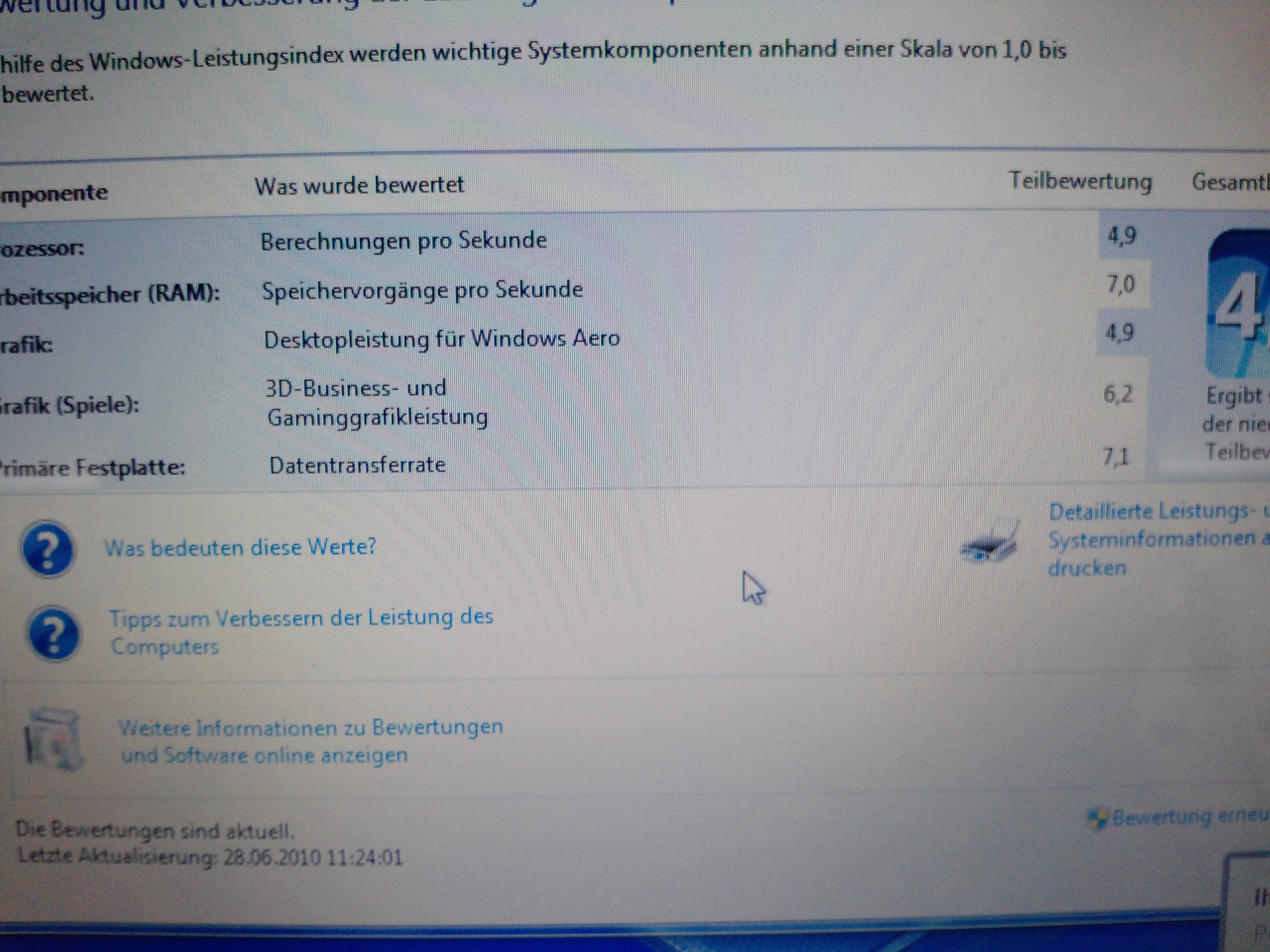 @mg.roth: Wer hat Dir denn so was erzählt? Ich habe meinen Leistungsindex beim alten Notebook nicht manipuliert, wozu denn auch? Und wenn ich das getan hätte, wäre meine Frage zum veränderten Leistungsindex ziemlich dämlich gewesen, nicht wahr? Ich will hier niemanden auf den Arm nehmen, noch verarschen, bis jetzt hat es auch niemand bei mir versucht. Ich war mit meiner alten Festplatte damals unzufrieden und habe mir eben eine WD Scorpio Black mit 320 GB zugelegt und die Festplatte ausgetauscht. Die neue WD-Platte ging ab wie eine Rakete und ihr Leistungsindex stieg eben auf 7.1, wer's nicht glaubt, hier ist der Screenshot: