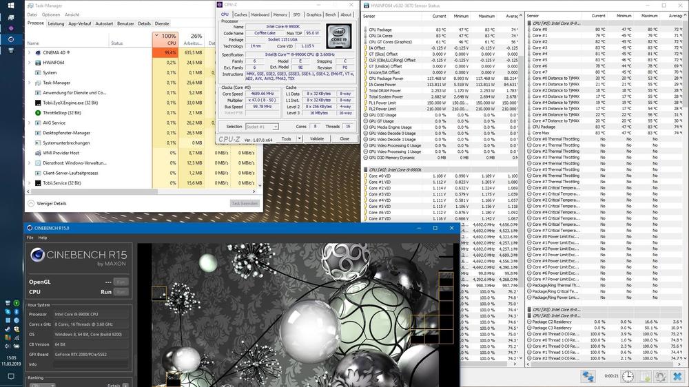 Leider sind im Taskmanager ja keine weiteren Prozesse gelistet, die noch nennenswert CPU-Zeit schlucken. Was ich allerdings auffällig finde ist die Zeit bis CB 99,x% Leistung bekommt. Das scheint im "echtzeit"-Modus deutlich schneller zu erfolgen! Ich bin mal gespannt was Dein System Stock macht. Wenn ich mir den Score von @K54 ansehe liegen wir ja gleichauf, aber deutlich unter dem was im Netz zum 9900K zu finden ist. -
