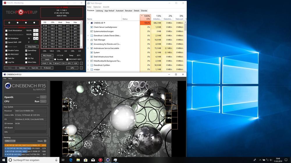 So ich habe noch einiges probiert und Screenshots gemacht. Screenshot 1 = normales System CB-Score = 1933 Screenshot 2 = frisches System CB-Score = 2020 Es scheint als dauert es im normalen System einige Sekunden bis CB 100% Leistung bekommt und auch dann liegen nicht 100% sondern nur 99,4% - 99,9% an. Das Abschalten einiger Prozesse die 0,1% Leistung "fressen" bringt etwas aber nicht den Durchbruch. Aber ich denke ich habe etwas gefunden. Im Taskmanager die Priorität von CB auf "echtzeit" setzen, damit springt der CB-Score im normalen System auf 2035!