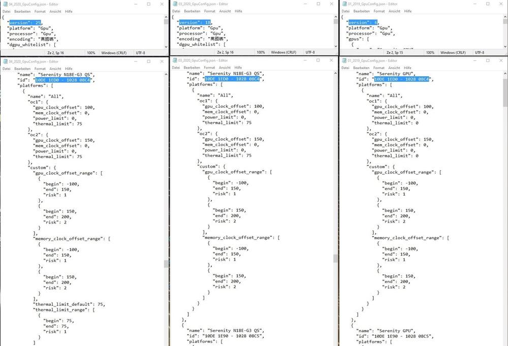 Richtig die Datei: Signature.json enthält die Dateien und zugehörigen Signaturen. Diese Datei wird auch immer neu erstellt (wenn man sie verändert oder löscht). Hier der Inhalt der Datei: Profile.json. {"active_profile":{"id":"92ba744b-4cf8-4281-a8de-f8f1d3524d8c"},"custom_profiles": [{"cpu":{"auto_overclocking_level":0,"enabled":false,"frequency":5.2,"voltage":1.24,"voltage_mode":"auto","voltage_offset":0},"default":false, "gpus":[{"enabled":true,"gpu_clock_offset":63,"memory_clock_offset":0,"power_limit":0,"thermal_limit":75}],"id":"95560fa3-9683-45f1-a62c-944adf55904e","memory":{"enabled":true,"index":1},"name":"GPU-Limit","readonly":false}],"display_adapters":[{"device_id":"10DE 1ED0 - 1028 08C4","name":"GeForce RTX 2080"}],"platform":"Alienware Area-51m","processor":"Intel(R) Core(TM) i9-9900K CPU @ 3.60GHz"} Hier sieht man die Einstellungen aus meinem custom-Profil für die GPU. Aber nirgends im Dateisystem / Registry finde ich den Namen des Profils / die hinterlegte ID. Ggf. könnte man hier ansetzen, oder vielleicht viel besser die Werte im Speicher verändern und als "offizielle" Werte durch das AWCC als custom-Profil speichern lassen. ? -