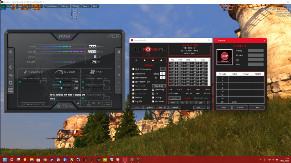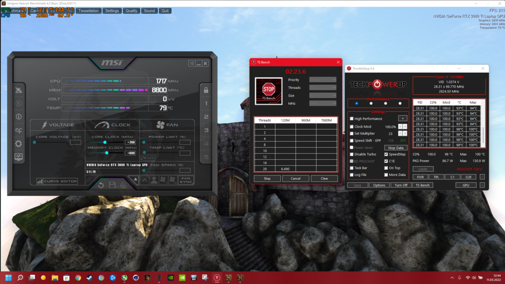Interessant dein Ergebnis. Hab mal Heaven auf Max-Settings gestellt und ohne UV mit dem i7 12700h genau das selbe Szenario durchgeführt. Hast du deine maximale Aufnahme von der CPU limitiert? Hier mal auf 80 Watt limitiert und länger laufen lassen -