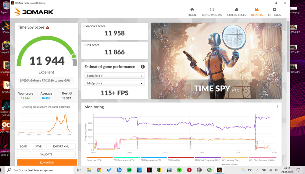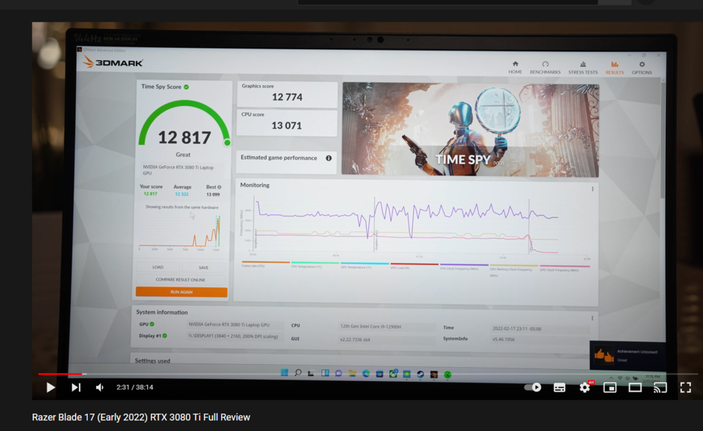 Ja bin auch am überlegen mein Mid zu verkaufen mit Max Konfig. 3080, i9, 120 Hz 4k, Dbrand etc. Aber die "Mehrleistung" ist dann auch nicht so hoch abgesehen von Alder Lake. Und mein Razer ist ein hammer Gerät welches selbst Silent noch eine extrem gute Performance abliefert. @pitha1337 Hab dir mal den Bench und die Optik angehängt. Der untere ist vom neuen mit der RTX 3080 TI und dem 12900h -