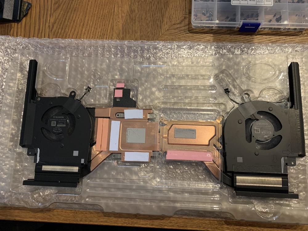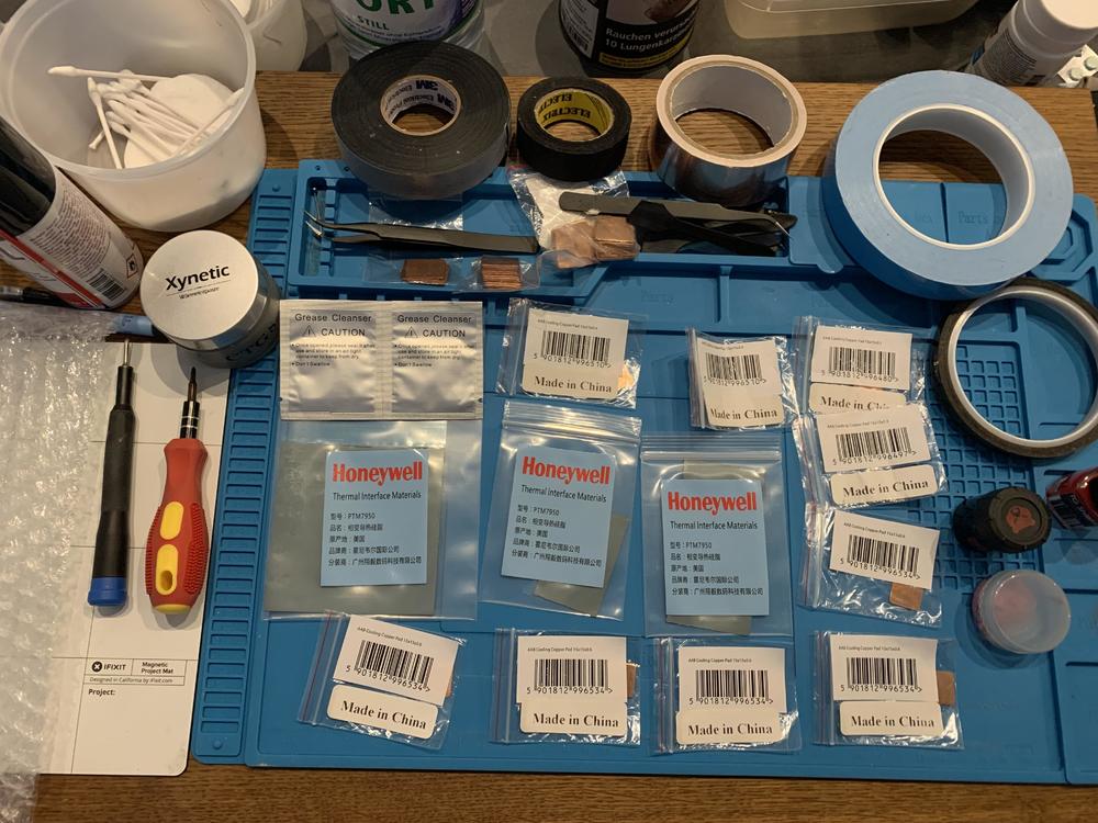 An alle: Ich habe mir eine zweite Heatsink für das X17 R2 besorgt und so gut wie jedes Kupferplättchen was ich kriegen konnte (15x15 und 20x20 in 0,1 - 2 mm), Kryonaut Extreme genug Kaptonband, Thermisches Klebeband, die berüchtigten Honeywell Pads, die von Lenovo Stock verwendet werden, sowie Kupferband und elektrisches isolierband in mehreren Ausführungen. Da meine Heatsink ja etwas kaputt war und ich das Problem an der CPU nur mit 2 20x20mm Kupferpads mit LM auf DIE und auf HS lösen konnte, dachte ich an einen Copper-Mod fürs X17 R2, Wer hat Interesse das mit mir gemeinsam durchzuziehen? Equipment ist genug da. Welche Kupferpads ich wo verwenden würde, wäre noch offen und müsste ermittelt werden. Ich brauch hier definitiv das WISSEN und die ERFAHRUNG der Community speziell an die Leute gerichtet, die schon einmal Copper-Mods durchgeführt haben. Alles weitere gerne per PM. @Sk0b0ld @captn.ko @pitha1337 Ziel ist es nicht unbedingt LM zu verwenden und überall da wo Pads drauf sind Kupferplättchen drauf zu packen sowie eine Schicht unten Kryonaut extreme und eine oben. Wer kann/hat bock mir dabei zu helfen? Aktuelle Leistungsdaten: CBR23 - 19300 Punkte i7 12700h RTX 3080 Ti knapp 14k im TimeSpy mit OC was meint Ihr kann man da noch was rausholen? Ich hab aufjedenfall BOCK die Kühlung dementsprechend zu optimieren, dass man noch ordentlich was rausholen kann. Unterbodenkühler hab ich auch, mit 3X Thermaltake Toughfan 12 mit Noctua PWM Controller. (Ich weiß der sieht alles andere als gut aus, sollte aber erstmal nur tun) So sollte die Präparation aussehen, bevor man auch nur daran denkt, da Kupfer draufzupacken. -