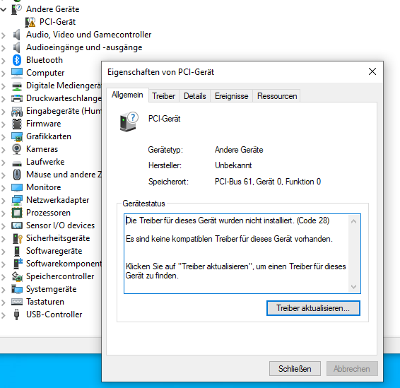 5. Soweit alles gut gelaufen. Bin begeistert. Hab aber im Gerätemanager ein PCI-Gerät mit einem Fehler. Nach Treibern hab ich auch schon gesucht. Leider Fehlanzeige. PCI-Bus 61 ..... weiß jemand was das ist? Hab im Internet nichts brauchbares gefunden.