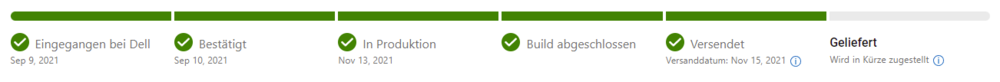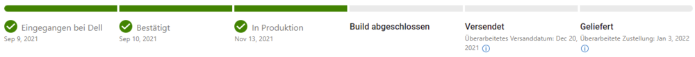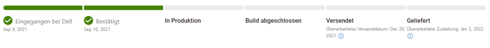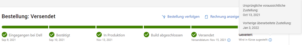11. Kurze Zusammenfassung: Bestellt: x17 R1, 4K, 3080 16GB, 32GB XMP, I9 11980HK. 05.09.21 Bestellt 09.09.21 Wegen Zahlungsproblemen erst bei Dell eingegangen 10.09.21 Bestätigt 28.09.21 Voraussichtliches Versanddatum 13.10.21 Geschätzter Zustellungszeitraum 29.09.21 Online Statusänderung ohne Email Benachrichtigung 10.11.21 Überarbeitetes Versanddatum 25.11.21 Überarbeitetes Lieferdatum ENDE. Auf der Dell Seite sind die X17 3080 mit 16GB ausverkauft..... Bis dato steht mein Status noch immer auf "Bestätigt".