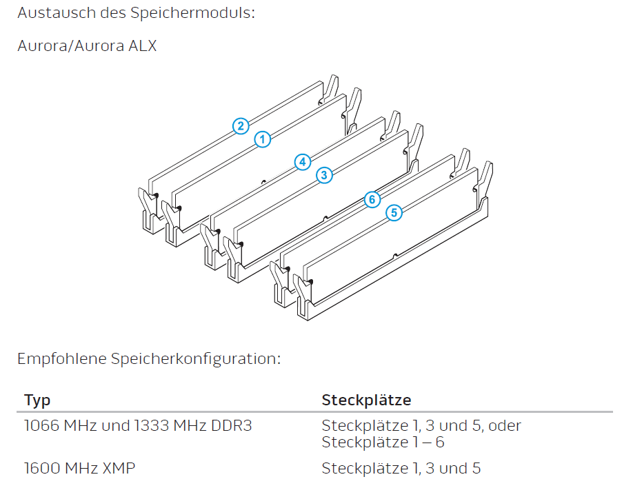 Ok, es handelt sich bei deinem Gerät um ein Alienware Aurora (R1). D.h. das Motherboard unterstützt folgende Speicherkonfigurationen (zur Information): Bis zu 24GB Tri-Channel DDR3 SDRAM at 1333Mhz - 6 DIMMS Bis zu 12GB Tri-Channel DDR3 SDRAM at 1600Mhz - 6 DIMMS Bis zu 6GB Tri-Channel DDR3 SDRAM at 1866Mhz - 3 DIMMS Dein neuer Riegel scheint an sich die richtigen Spezifikationen zu besitzen. Sonst würde der Rechner gar nicht erst booten und nur einen Beep-Code von sich geben. Was man jedoch nicht ausschließen kann ist ein Hardwaredefekt (des Ram-Riegels) oder Kompatibilitätsprobleme die den Ram instabil laufen lassen. Wenn du Lust hast und es dir zutraust, dann kannst du mal ins BIOS gehen und dort diverse RAM-Taktfrequenzen fest einstellen. Standard sollte "Auto" sein ... Eventuell läuft er auf 1333Mhz oder 1066Mhz stabil. Weiterhin solltest du sicherstellen, dass du den einzelnen Riegel im Slot 1 eingesetzt hast. Dieser Grafik kannst du weiterhin entnehmen welche Speicherkonfigurationen für dein Gerät empfohlen sind. Da du einen Geschwindigkeitsvorteil anvisierst, wirst du diesen mit nur einem 4gb Riegel nicht erreichen. Eventuell überlegst du dir den Erwerb 3 gleich großer 1600er XMP Ram-Module, die du in den Slots 1,3 und 5 unterbringst. -
