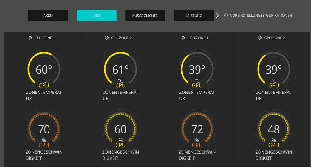 Moin zusammen, nutze meinen Alienware jetzt ein paar Tage und irgendwie bin ich total unsicher mit dem ACC und den Modus den man Auswählen kann. Obwohl ich nur meinen Brower "Chrome" offen habe und nur auf Youtube drauf bin, habe ich im Modus "Leise" und ebenfalls im Modus "Ausgleich" so hohe Temperaturen. Ist das Normal ? Und obwohl ich im Modus "Leise" bin, sind die Lüfter eigentlich immer auf mittlere Stufe an. Im "Ausgleich" laufen die Lüfter manchmal nur auf "Stufe 1" oder gar nicht, aber dafür wird der etwas wärmer. Ich habe mal Bilder vom ACC hochgeladen, ist das soweit normal? Ich habe meinen Laptop bekommen und nichts gemacht bis auf alle Updates aufgespielt (Win, von Dell und Graka) Hatte erst überlegt Windows komplett neu aufzusetzen, aber macht das Sinn ? Vielen Dank und liebe Grüße DTalon