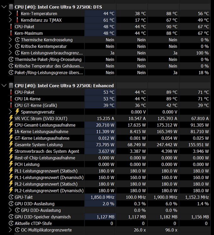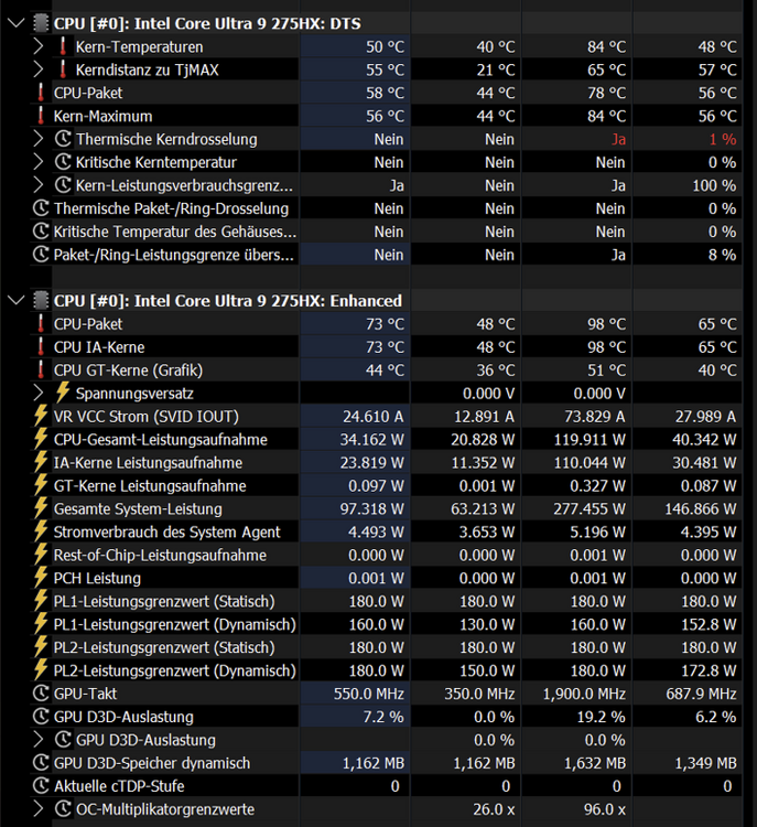 7. Guten Morgen, klasse! Vielen Dank für die Leistungsdaten! Ich halte meins nun auch endlich in den Händen und habe bereits auch ein paar Tests laufen lassen. Deine Temperaturen verblüffen mich! Cinebench Temperaturen im Performance Modus laufen beim mir um die 98 Grad bis zur thermischen Drosslung bei 104 Grad. Software, Bios und Hardware identisch zu Deiner Konfiguration. Im Time Spy wird die CPU nicht so beansprucht. Da hält sich die Temperatur so um 70-75 Grad. Sollte ich mir Sorgen machen das da etwas nicht korrekt verbaut ist?