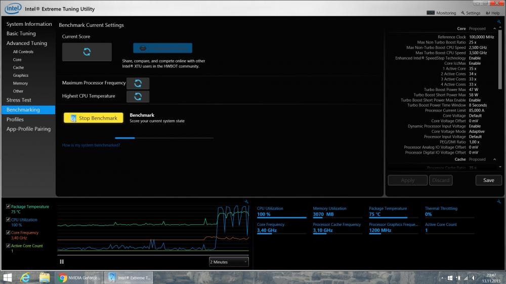 Alienware 17 R2 4710HQ nur 1 Kern aktivmax_es antwortete auf max_es's Thema in Allgemeines & Troubleshooting Im Taskmanager werden 4 Kerne angezeigt. Ich denke auch, dass 4 Kerne aktiv sind, jedoch die Leistung der CPU ordentlich nachlässt wenn die GPU übertaktet wird. Genauer gesagt brechen die Werte der CPU ein sobald ich der GPU mehr Spannung gebe. Auch wenn ich die Spannung der CPU um 50mv senke und die der GPU um 50mv anhebe kommt es zu massiven Einbrüchen. Ich werde der GPU einfach nicht mehr Spannung geben, eine andere Lösung fällt mir nicht ein. Hier mal der 3DMark mit +180core und +280memory. Das funktioniert ohne Overvolt und somit sind die Werte der CPU auch normal. http://www.3dmark.com/3dm/9287895 Vielen Dank für eure Hilfe!!