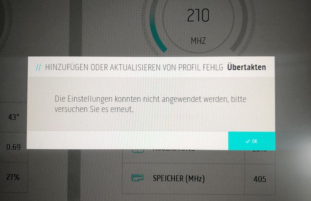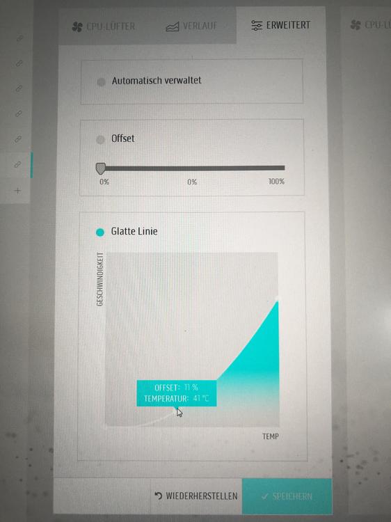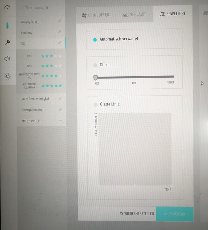 4. Ersatzgerät ist nun in Betrieb, leider etwa 8 dB bei Medien schauen lauter als der vorherige. Beim Versuch ein neues Übertaktungsprofil anzulegen kommt die Meldung dass es nicht geht. CC habe ich jetzt schon zweimal neu installiert, ändert leider nichts. Hat jemand noch einen Tipp? ich wollte das Lüfter Profil „leise“ jetzt so ändern dass es auch wirklich leise ist, bin hier aber überfordert wie ich das anlegen soll? wenn ich unten eine Kurve anlege mit zum Beispiel bei 50° 20 % Lüftergeschwindigkeit, hält sich das CC nicht ran. Teilweise dann 70 % oder andere Werte…