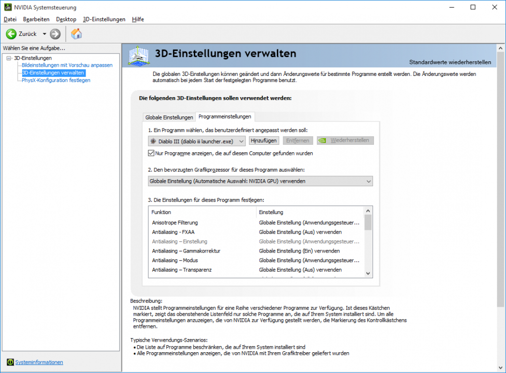 Nein, umschalten erfolgt mit Nvidia - Optimus. Man kann aber die onBoard im Gerätemanager deaktivieren. Würde auch Die verfügbaren Optionen bei Dir in der Nvidia - Systemsteurung erklären. Bei mir sehe ich nur das ... (siehe Anhang), den Rest erledigt nämlich die Intel onBoard. Und mit Optimus habe ich persönlich bisher keine Probleme.