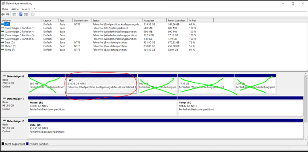 meinst du aus den 4 Partition nur 1 machen ? Das wäre bedeuten, die auf dem Bild grün markierte Partitionen löschen und nur einen Partition erstellen ? -