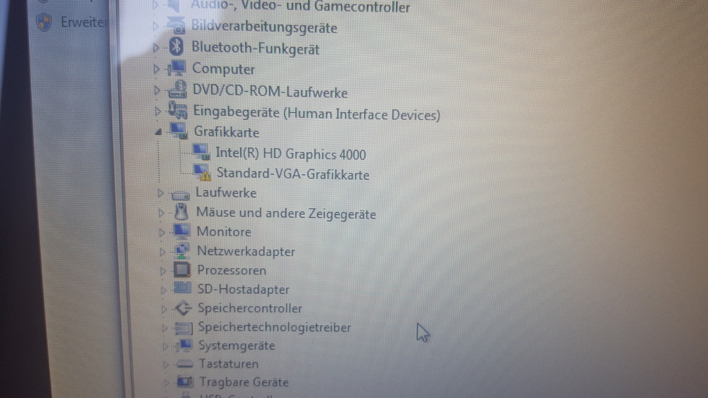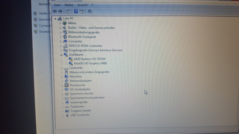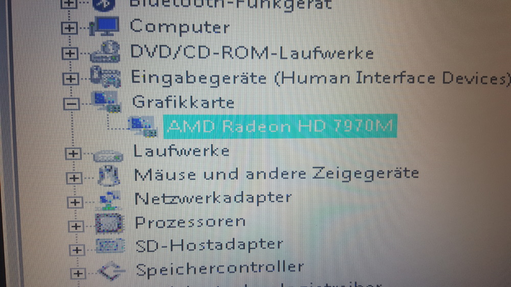 21. Hallo und danke für deine schnelle Antwort. Im Bios werden beide Grafiklösungen angezeigt. Hab ein Bild hochgeladen. im Gerätemanager auch. Das mit dem Manuell umschalten war eine gute Idee. Das hab ich gleich einmal gemacht, und er wollte daraufhin ein Neustart. Danach hat er (wahrscheinlich) mit der AMD gestartet. Allerdings erhielt ich eine Art Endzeit-Grafik -.-° Obwohl gleich unten stand: Standard VGA Grafik installiert. Daraufhin hab ich mich durch dieses Grafik-Wirwa gequält und den AMD Treiber von der Dell Seite installiert. nach dem Neustart ---> schwarzer Bildschirm. Über den gesicherten Modus konnte ich den Treiber wieder deinstallieren, danach die GPU wieder auf die Intel4000 zurück wechseln. Danach hab ich das ganze noch einmal mit dem neusten AMD Treiber versucht ---> gleiches Bild. hier die Liste der Treiberreihenfolge: Intel Chipset Driver Intel Management Engine Interface Driver Intel HM77 Panther Point Chipset Chipset_Driver_96CDY_WN_6.1.7601.28099_X04.EXE DELL,SR Intel USB 3.0V,SW,CHIPSET,MEI,ANW,M17XR4,8.0.0.1399,A00 Intel USB 3.0 eXtensible Host Controller Driver DELL,SRV,DRVR,USB 3.0,AV MLK,1.0.3.214,A00 Realtek RTS5209 Card Reader Driver ----------------------------------------------------------------------------------- Intel HD Graphics Driver AMD Radeon HD 6870M/6970M/7970M/6990M Graphics Driver ------------------------------------------------------------------------------- Intel Rapid Storage Technology Driver -------------------------------------------------------------- Atheros AR8151 PCI-E Gigabit Ethernet Controller Driver Qualcomm Killer Wi-Fi Driver --------------------------------------------------------- DELL,SRV,SW,TPAD,ANW,M17XR4,16.0.4.0,A01 Creative Labs CT9570 Audio Driver ST Microelectronics Motion Sensor Driver ----------------------------------------------------------------- Dell Wireless 380 Bluetooth Driver Alienware Command Center Application Alienware On Screen Display Application
