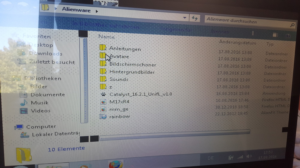 19. uiuiui, da hast du dir aber Mühe gemacht. Vielen Vielen Dank. ich versuch mal, der Reihenfolge nach alle deine Fragen zu Beantworten. - Der Enduro-Modus ist aktiviert, denn bei dem "nur" AMD Modus ist die Grafik sooo schlecht, das man kaum etwas erkennen kann (siehe die alten Grafik Bilder). - Im Bios habe ich nichts gefunden, wo man die Intel HD Grafik ändern/anpassen kann. - Das Comand Center hat die Version 2.8.8.0 und er findet auch keine aktuellere Version. - Das CC funktioniert einwandfrei. Hab auch das Rainbow-Profil hier aus dem Forum geladen und es funktioniert klasse. - Ich besitze noch das Alienware 17 R1, das m11xr3 und "noch" das m15x. Diese sind auch alle voll funktionstüchtig und stehen zur Verfügung - als SSd ist die: SSD Crucial M500 960gb 2,5" Sata 6gb eingebaut. - im Bios steht hinter die Sata Option RAID (wie du dir schon richtig gedacht hast). - Treiber hab ich alle runter geladen und der Reihenfolge nach benannt. Zudem hab ich noch eine gute Nachricht. Ein Kumpel von mir hat die Gleiche Grafikkarte in seinem Laptop. und er kommt morgen Abend vorbei und wir tauschen diese dann einmal quer. So können wir schon mal ein defekt der Karte ausschließen. Da ich Urlaub hab, würde ich mich mit der Installation voll nach deiner Zeit richten. Gruss Stephan
