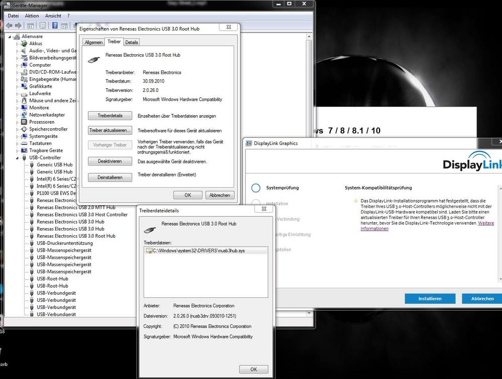 Hallo Leute, ich hoffe, mir kann geholfen werden... Ich wollte einen zusätzlichen 2. Monitor anschließen (einer hängt schon am HDMI) und habe mir dafür eine externe GraKa mit DisplayLink-Chip geholt (Wavlink usb 3.0). Bei der Installation des Treibers erhalte ich die Fehlermeldung, dass der Treiber des USB 3.0 Host Controllers nicht mit dem Treiber des DisplayLink kompatibel ist. Siehe Bild im Anhang. Nun soll ich den Treiber meines USB 3.0 Host Controllers aktualisieren. Dazu finde ich aber nichts. Die Dell-Seite gibt schon gar nichts her. Installiert ist derzeit "Renesas Electronis USB 3.0" in der Version 2.0.26.0 (nusb3drv 093010-1251). Im Installtionsfenster habe ich bereits auf "weitere Informationen" geklickt und die da zu findenden Treiber installiert, hat nichts gebracht. Die Treiber, die auf der CD sind (siehe unten), habe ich auch installiert, hat auch nichts gebracht. In den Treiberdetails bleibt auch immer die dort angegebene Version 2.0.26.0 stehen. Komischerweise hatte ich vor ca. 2 Jahren zwei zusätzliche Monitore an einem Hub und einer alten externen USB 2.0 GraKa und das hat einwandfrei funktioniert. Ich weiß nicht, was sich zwischenzeitlich geändert hätte. Auf der Treiber-CD von Wavlink ist eine *.txt enthalten, in der steht: "Note: Some USB 3.0 host card require installment of newest driver for the adapter to reach optimal USB 3.0 output performance. click here to install newest USB 3.0 Host drivers. (recommeded) Asmedia_USB3_Host for Asmedia 104x USB3.0 Host Card Fresco_Logic_USB3_Host for Fresco Logic USB 3.0 Host Card NEC_D720200_USB3_Host for NEC USB 3.0 Chipset D720200" Aber mit diesen Treibern kann ich ja wohl eher nix anfangen, oder? System: Win7 64 HP, GraKa AMD HD 6900M, angeschlossen ist ein 7-fach USB 3.0-Hub, an den die Wavlink-Graka angeschlossen werden soll. Da hängen weitere HDs dran. Kann mir da jemand vielleicht weiter helfen? Danke schon mal... >> EDIT: hat sich erledigt. Ich habe die Installation trotz des Treiberupdate-Hinweises (nach Inst des auf der CD mitgelieferten Treibers) fortgesetzt, Monitor angeschlossen und siehe da: läuft (ging bei einer voran gegangenen Installation noch nicht!...). Danke für's Lesen. ? <<