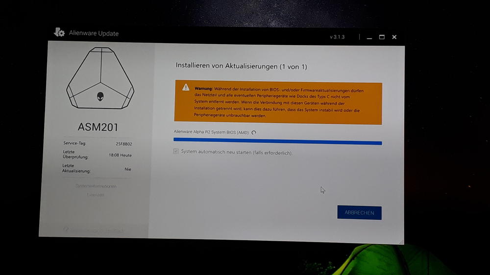 Guten Abend, ich versuche seit etwa zwei Stunden das neuste Bios Update zu installieren, egal ob direkt auf der Dell Seite, oder beim Alienware Update Programm, es downloadet die 11MB und schafft es nicht mal nach 2h Wartezeit zu installieren (Bild im Anhang), weiß zufällig jemand ob es da mal früher vielleicht schon Probleme gabe? -