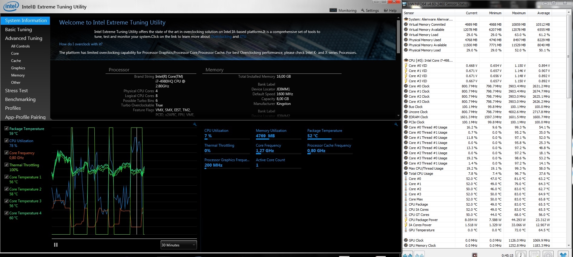 Jetzt kamen ab Sonntag Abend beim Zocken Probleme. War bei 30 min Witcher 3 HoS. Plötzlich kam es in kurzen Abständen zu Rucklern. HWinfo und Intel ETU laufen lassen. Die Temperaturen finde ich nicht schlecht, trotzdem tritt laut Intel ETU 100% Thermal Throttling auf und die CPU taktet auf 800 Mhz runter. Vor dem Service Einsatz war auch der Durchschnittstakt anders- nämlich bei ca. 3550 Mhz- hier nur 2650... Die Problematik vom 100% Termal Throttling lässt sich per Prime+Furmark nach 1-2 min reproduzieren- hier steigen die Temperaturen mittlerweile höher als vor dem Service Einsatz. Beim Cinebench r15 hab ich auch nur noch 550 Punkte, obwohl ich vorher fast 700 hatte, der Turbo wird nur zur Hälfte ausgenutzt. Hab alles ausprobiert- vschd. Biosversionen, alle Intel Sachen neuinstalliert(sowohl Dell bereitgestellt, als auch Intel direkt), Energiesparpläne gecheckt. Hat irgendwer noch eine Idee? Morgen wird der Service nochmal kontaktiert. -