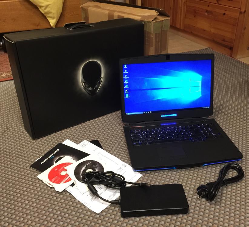 Hallo, ich verkauf mein Alienware 17 R1, da ich jetzt den kleineren 15 R2 besitze. Das Alien ist in einem guten Zustand und ohne große Fehler/Macken. Er wurde von mir immer sorgfältig behandelt, regelmäßig von Staub gereinigt und erst vor wenigen Monaten mit neuer Wärmeleitpaste versorgt. Auf der Handballenauflage und Tastatur sieht man nur leichte Gebrauchsspuren, da ich meistens eine externe Maus und Tastatur angeschlossen hatte. Der gummierte obere Teil des Display Deckels hat kleine Abreibungen an den Ecken, die man aber kaum sieht. Der Deckel des Display hat eine kleine Macken (siehe Foto). Zuletzt noch: ich bin Nichtraucher, in meinem Haushalt ist niemand Raucher und wir haben keine Haustiere. Ich habe das Alien von einem Nutzer hier im Forum gebraucht gekauft. Dieser hat das Notebook am 29.05.2014 gekauft, VOS ist noch bis 29.05.2016 vorhanden. Ausstattung: original Verpackung Anleitung + original Rechnung Recovery DVDs mit Windows 8.1 Pro und Treiber 240 Watt original Netzteil + Kaltgerätekabel 17 Zoll Display, 1920x1080 Intel i7 4710MQ (2,5 GHz mit bis zu 3,5 GHz Turbo Boost) nVidia GTX 880M 8 GB 16 GB Ram (4 x 4 GB 1600 MHz) 256 GB mSATA SSD 1 TB HDD Killer NIC 1202 WiFi Slot-Loading DVD Brenner installiert: Windows 10 Pro VOS bis 29.05.2016 Preis: 1200 € VB + Versand Bei Fragen einfach schreiben, Preisvorschläge bitte per PN. Gerne kann ich auch noch weitere Bilder auf Anfrage hochladen. Ich reagiere nur auf vernünftige Angebote, kein Tausch. Bezahlung bitte per Überweisung, verschicken werde ich das Notebook als versichertes Paket per DHL. Als privater Verkäufer schließe ich jegliche Gewährleistung aus.