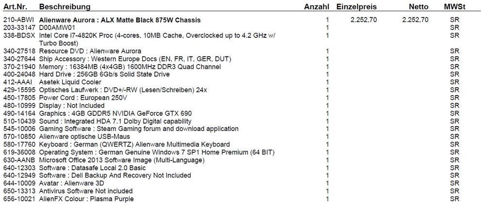 1. Guten Tag liebe Community, ich besitze seit fast 3 Jahren einen R4 den ich mir zusammen gestellt habe. Da zwecks Zeitmangel kaum noch gezockt wird habe ich mich entschlossen meinen Rechner hier anzubieten. Hier grob die Daten. Habe auch ein Bild mit allen verbauten Sachen angehängt. Prozessor: Intel Core i7-4820K Prozessor (vier Kerne, 10 MB Cache, übertaktet, bis zu 4,2 GHz mit Turbo Boost) Arbeitsspeicher: 16.384 MB (4 x 4 GB), 1.600 MHz DDR3-Quad-Channel-Speicher Grafikkarte: 4GB GDDR5 NVIDIA® GeForce® GTX 690 Festplatte: Solid-State-Festplatte (SSD) mit 256 GB (6 Gb/s) Soundkarte: Integriertes HDA mit Dolby Digital 7.1 Alienware ASETEK CPU-Flüssigkühlung Da ich damals 2500€ gezahlt habe wäre meine Vorstellung ungefähr 800€ weit runter gehen tu ich nicht aber ein Angebot könnt ihr mir ja machen