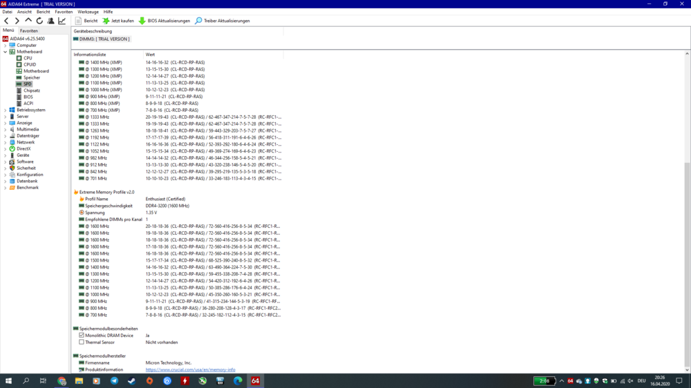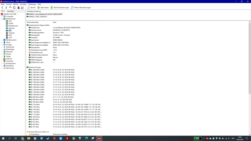 13. Hallo an alle, ich habe mal eine frage an euch alle bzgl. XMP Profile bei diesem Gerät. Folgende Situation: Ich habe wie bereits in einem anderen Thread beschrieben ein Ram Upgrade gemacht. Zuvor hatte ich den Standard Ram von Dell drin, sprich 2x8GB 2400Mhz bei cl17. Nun war ja meine Idee auf auf 32GB bei 3200mhz zu gehen und habe hier ja nun im Forum einmal meine Idee hinterfragt. Schlussendlich habe ich mich doch für den Kingston HyperX mit 2666mhz entschieden. Dies hatte jedoch einen defekt, welcher mir nach 2 Wochen durch diverse neu Fehler auffiel. Daraufhin habe ich nochmal memtest86 durchlaufen lassen und siehe da, einer der Riegel hatte tatsächlich einen defekt. Nun habe ich erneut nach speicher gesucht und dabei ist mir der neue Crucial Ballistix mit 3200mhz aufgefallen. Kurzerhand bei Curcial nach Kompatibilität geguckt und dort wurde eine 100% kompatibilität zugesagt. Also Speicher bestellt mit dem wissen im Hinterkopf das dieser evtl nicht auf seinen vollen 3200mhz laufen wird. Aber meine Vermutung war, das dieser speicher auch bei 2666mhz eine geringer Latenz haben müsste als der von Kingstont. Folgendes stellt ich nun fest: Laut JEDEC läuft der Kingston bei 2666mhz bei cl19, mit XMP bei cl15 Der Crucial läuft laut JEDEC bei 2666mhz logischweise auch mit CL19, kann jedoch mit aktivierten XMP auch CL14 Evtl kann der Crucial jedoch auch mit 3200mhz laufen sofern das XMP Profil geladen wird, das weiß ich jedoch noch nicht. Der Kingston hat automatisch das XMP Profil laden können bzw hat der PC automatisch geladen, so wie es die meisten wahrscheinlich kennen: Alter Speicher raus, neuer Speicher rein, Laptop booten lassen und läuft mit XMP bei 2666mhz und CL15. Beim Crucial ist es nun so das nur JEDEC Spezifikationen geladen werden, jedoch nicht das XMP Profil. Ich kenne das noch aus meinem alten Alienware m18x, da man dort das Profil direkt aktivieren musste, jedoch gibt es diese Option nicht im 17R4. Kann mir hierbei jemand weiter helfen, denn zur Zeit läuft mein Speicher weit unter seinen Möglichkeiten und evtl können wir weiteren Interessenten hiermit helfen. Besten dank an alle. hier noch einmal ein Bild von meinen besagten Modulen und den Dazugehörigen Spezifikationen: