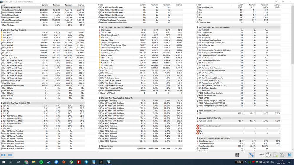 Vielen dank für deine Antwort, Hier habe ich einmal einen Screenshot von HWinfo und ein Bild wie die Wärmeleitpads bei mir aussahen bzw. lagen. Ich hab diese nicht angerührt. Meines Erachtens sahen diese aber noch sehr frisch aus da das Notebook die letzten Jahre so gut wie nie genutzt wurde (habe es gebraucht gekauft). War auch erst skeptisch, aber als ich Ihn auseinander nahm und gesehen hab das tatsächlich so gut wie kein staub im Gehäuse war wurde meine Annahme bestätigt. Bitte wundere dich nicht, auf dem Bild habe ich erstmal nur grob die WLP runtergeholt d.h. die Die`s sind noch nicht gesäubert. Ich habe auch schon mal versucht Ihn wie gesagt hinten anzuheben, dabei gingen wie beschrieben die Temperaturen auch schon runter, jedoch hatte er immer noch das Throttling. Ich habe auch mal die Zeit gemessen wie lange er Throttelt (ca.1,5min). Danach hab ich das ganze Notebook Hoch genommen und geguckt das ich einen Lüfter unterstelle (direkt in die Mitte der Lüftung um die Heatpipes direkt abzukühlen). Aber auch dabei Blieb er ca 1,5min beim Throttling. Evtl kannst du ja aus dem Screenshot ermitteln warum er diese Problematik hat. In diesem Screenshot ist bloss nicht zusehen das PROCHOT aktiviert wurde. Dies ist aber sonst immer der Fall, hab den Screenshot nur eben kurz aufgenommen wo ich ca. 10 min gespielt habe und er noch nicht gethrottelt hat, möchte nicht das er evtl dadurch noch schaden nimmt. Was mir jedoch immer aufgefallen ist, ist die Tatsache das der PCH immer sehr warm wird, kannst du mir bestätigen das dies normal ist oder ist dieser evtl. der Verursacher? Beste Grüße Dies ist jetzt nochmal ein Screenshot wenn er am Throtteln ist. Ich denke damit kannst du mehr anfangen -