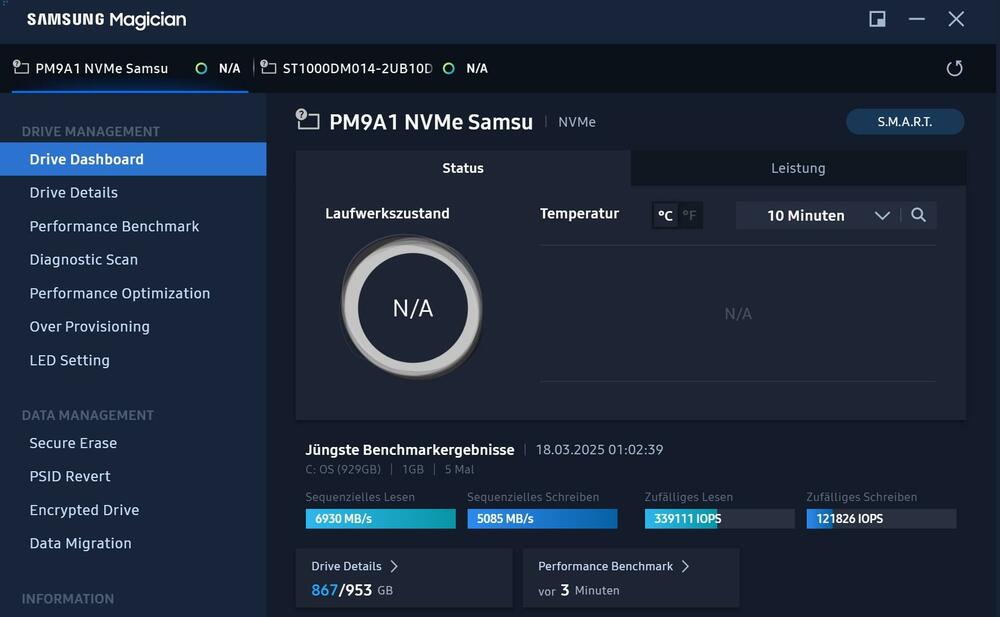 16. Die SSD ist wohl von Samsung.Aber wirklich Daten kann ich nicht auslesen.Konnte nur einen Performance Benchmark machen.Aber ueber die Temps sagt der mir auch nix.