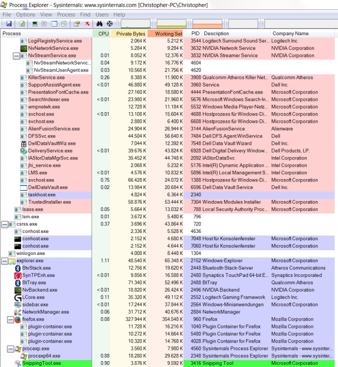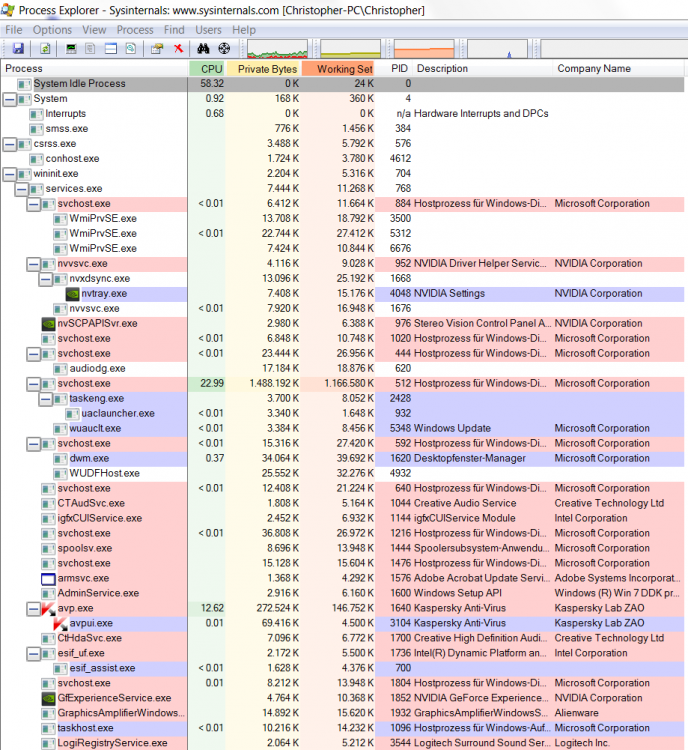 Okay das mache ich dann alles mal am Sonntag. Habe morgen leider keine Zeit. Hab aber gerad noch ein bisschen rumgegoogelt und kam in ein Forum wo Leute schrieben das sie auch starke FPS Drops haben das anscheind AlienRespawn auslöst. Habe es daraufhin mal deinstalliert und bis auf fps drops am anfang des Spiels und paar kleine zwischen durch, scheint es auch wirklich besser zu funktionieren. Allerdings bleibt meine Cpu Auslastung nachdem ich einmal ein Programm gestartet habe, dauerhaft bei 15-20% obwohl ich alles wieder geschlossen habe. Finde ich ein bisschen seltsam. Kann ich hier irgendwo ein Bild einfügen? Also ich habe mich im Taskmanager mal umgesehen was soviel Leistung frisst und da ist eine svchost.exe die 12% CPU und 1.000.000 K Ram beansprucht. Sie wird vom System ausgeführt. Was ist das?