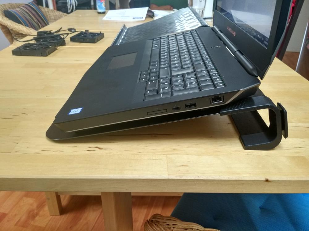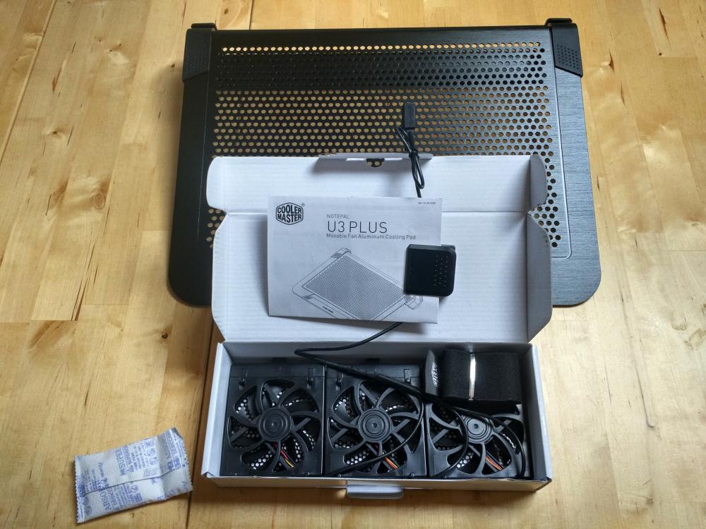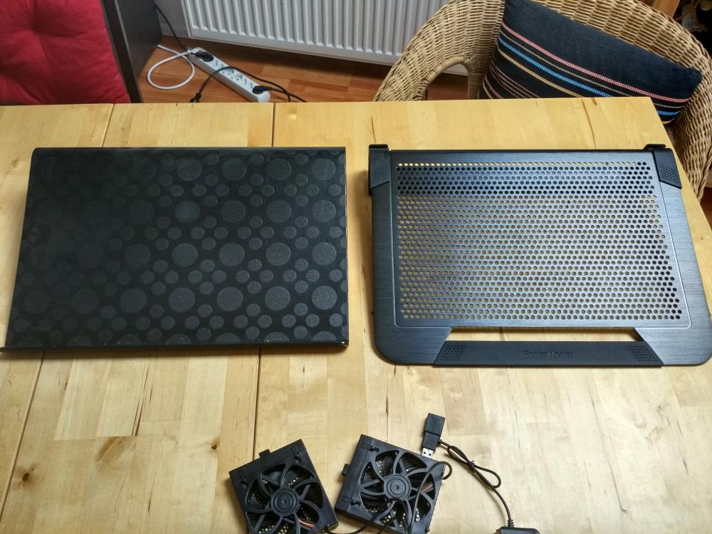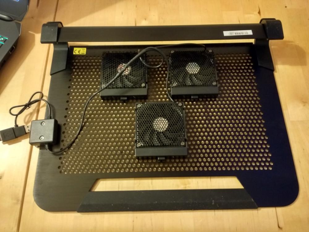 Review des Cooler Master NotePal U3 Plus ########################### Hallo liebe Gemeinde, gestern Abend habe ich den Notebookkühler Cooler Master U3 Plus bekommen, und ausgiebig mit Prime95 testen können. Ausgepackt empfing mich der metallerne Notebookständer sowie in einer kleinen Box der USB-Lüfter-Adapter samt Lüfterregelung sowie den drei Lüftern. # Montage: Die Lüfter werden mit einem cleveren Mechanismus befestigt, 2 Gnubbel werden eingehakt, 2 Gegengnubbel werden über einen Spannmechanismus (bestimmt eine simple Metallfeder im Innern) eingehakt, fertig. Leider ist an einem Lüfter 1 von 4 Gnubbeln nicht vorhanden, befestigt werden konnte dieser trotzdem. Auf diesem Foto seht ihr meine Lüfteranordnung, den Tips aus dem anderen Thread (*klick*) folgend habe ich 2 von ihnen auf die Lüftungsöffnungen neben den Ventilatoren angebracht, einen mittig auf die Revisionsklappe. # 1. Meinung: Schick & gut verarbeitet. Der Alienware 17R3 sitzt geschmeidig auf dem Notebookständer, die Gummielemente (am vorderen Bereich ein breiter Streifen, am hinteren sind die Ecken gummiert) geben perfekten halt. Die Größe ist wie angegossen für unseren "kleinen". # Testaufbau: Meine Konfiguration des 17R3 kann man meiner Signatur entnehmen. Die Raumtemperatur betrug 19,5°C. Als Vergleich diente ein Vollplastik-Notebookständer von Ikea, für ca. 10€. Dessen "Arbeitsfläche" ist durchgängig, d.h. nicht gelocht. Prime95 wurde 5-10 Minuten laufen gelassen, danach Rechner runtergefahren, 1-2 Minuten abkühlen lassen, wieder hochgefahren. # Die Ergebnisse (Screenshots aus Gründen der Übersicht entfernt): Ikea Unterlage: #1-1 No OC, Leerlauf: 42°C, max 45°C #1-2 No OC, Prime95: 68°C, max 77°C (Throtteling 2.9GHz) #2-1 OC-LVL3, Leerlauf: 51°C, max 55°C #2-1 OC-LVL3, Prime95: 74°C, max 85°C (Throtteling 2.7GHz, dabei Temperaturen von 59°C, springt aber sofort wieder auf 74-85°C hoch) Cooler Master NotePal U3 Plus (Lüfter aus!): #3-1 No OC, Leerlauf: 42°C, max 48°C #3-2 No OC, Prime95: 65°C, max 77°C (Throtteling 2.9GHz) #4-1 OC-LVL3, Leerlauf: 44°C, max 54°C #4-2 OC-LVL3, Prime95: 77°C, max 82°C (Throtteling 2.7GHz, dabei Temperaturen von 59°C, springt aber sofort wieder auf 77-82°C hoch) Cooler Master NotePal U3 Plus (Lüfter an!): #5-1 No OC, Leerlauf: 44°C, max 52°C #5-2 No OC, Prime95: 61°C, max 77°C (Throtteling 2.9GHz) #6-1 OC-LVL3, Leerlauf: 38°C, max 52°C #6-2 OC-LVL3, Prime95: 80°C, max 84°C (Throtteling 2.7GHz, dabei Temperaturen von 59°C, springt aber sofort wieder auf 80-84°C hoch) Cooler Master NotePal U3 Plus (Lüfter an, zusätzlich im BIOS den High Performance Mode aktiviert! (Video hier: VID_20160427_194212.mp4 )): #7-1 OC-LVL3, Leerlauf: 26°C, max 31°C #7-2 OC-LVL3, Prime95: 75°C, max 77°C (Throtteling 2.7GHz, dabei Temperaturen von 57°C, springt aber sofort wieder auf 75-77°C hoch) # 2. Meinung: Pro: Der metallerne Aufbau in Verbindung mit den Halt gebenden Gummielementen, sowie die Größe sind perfekt. Die Lüfter sind auf der höchsten Stufe vom Pegel her einem Kopierer im CopyShop im Standbybetrieb vergleichbar, also subjektiv leise. Auf der niedrigsten Stufe könnte man sie fast überhören, aber da unser Alienware ohne Last auch gar kein Geräusch macht, hört man sie eben doch minimal. Die abgewinkelte Form am höheren Ende des Notebookständers macht eine Ablage auf den Beinen (z.B. im Bett) sehr angenehm, in diesem Betrieb zum Film schauen o.ä. stören die Lüfter und die Kabel nicht. Als Vorteil ggü. meinem Ikeanotebookständer sehe ich die Soundentwicklung, die dank der fehlenden Aufkantung am vorderen Ende endlich nicht mehr wie aus einer Blechdose klingt (der Soundblaster Equalizer muss natürlich trotzdem angepasst werden). Ebenso rutschte der Alienware immer Richtung dieser Aufkantung nach vorne, eine Druckstelle an der vorderen Spitze des Rechners wollte ich vermeiden. Kontra: Die Ergebnisse betrachtend haben weder die luftige Lochblechkonstruktion des Notebookständers noch die Lüfter einen merklichen Anteil am Herunterkühlen unserer Gaming-Rechner. Lüfter an oder aus, Ikea oder Cooler Master, macht im Vergleich Leerlauf oder unter synthetischer Volllast fast keinen Unterschied (1-3°C Schwankung). Dies spricht entweder gegen den Cooler Master, oder für die Konstrukteure der Gummifüße unseres Alienware, die für den nötigen Abstand zu jeglicher Unterlage und damit für genügend Frischluft für die internen Lüfter sorgen. Der ca. 3cm vom Alienware abstehende USB-Lüfter-Adapter ist eine wackelige Angelegenheit und prädestiniert in einer ungünstigen Situation herausgerissen zu werden. # Beobachtungen: Die Lüfter sind mit 80mm einfach zu gering bemessen. Diese liefern jeweils, also 3x 15.42 m³/h (http://eu.coolermaster.com/de/cooling/notebook-cooling/notepal-u3-plus/), im Vergleich zum 230mm Lüfter des NotePal XL mit 89,8 m³/h (http://eu.coolermaster.com/de/cooling/notebook-cooling/notepal-xl/, dieser ist leider zu klein bzw. schweben die Gummifüße des Alienware links und rechts neben dem Ständer und dieser liegt somit auf) zu wenig. Bei Konfiguration #6 (OC-LVL3, Cooler Master Unterlage, Lüfter aktiv) habe ich alternativ die drei Lüfter in Reihe an den oberen Rand montiert, ohne einen Unterschied im Ergebnis bemerken zu können. Die Temperaturen bleiben gleich, Throtteling tritt nach wenigen Minuten auf. Ich denke es liegt also nicht an der Lüfteranordnung. Sogar ohne OC bringt der syntetische Benchmark Prime95 mein Exemplar des Alienware 17R3 zum Throtteln, 4 Kerne sollten laut (http://www.notebookcheck.com/Intel-Core-i7-6820HK-Notebook-Prozessor.149417.0.html) einen zeitweisen Turboboost bis zu 3.2 GHz unter Last ermöglichen, um nicht zu überhitzen pendelt sich mein CPU-Exemplar auch mal beim Basistakt von 2.7 GHz ein. Beim Zocken tritt dieser Zustand eher weniger ein, hier limitiert z.B. bei Far Cry Primal (alles auf Ultra) vorher die Grafikkarte. Wenn jemand die CPU zum rendern verwenden möchte