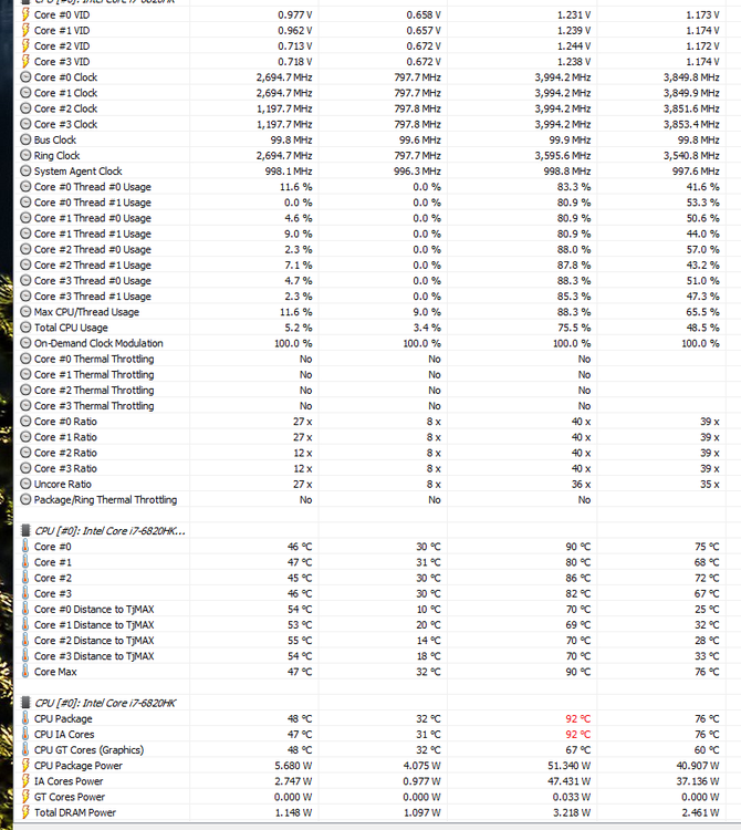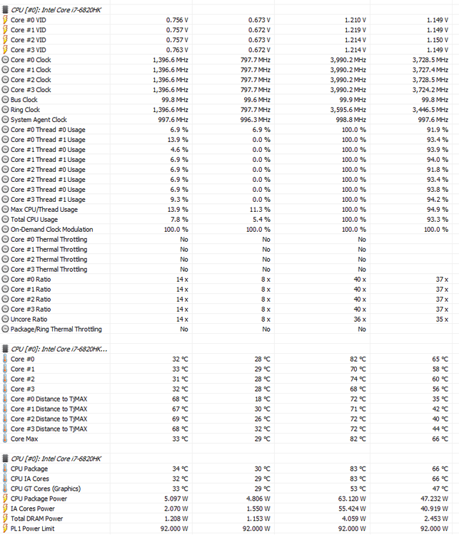 18. Die Unterschiede sind mir schon länger aufgefallen. Core #0 und #2 werden schlechter gekühlt, bei kurzzeitigen Belastungsspitzen mit OC sind die Unterschiede durchaus groß. Ohne OC und bei gleichmäßiger Belastung sind die Temperaturunterscheide alle innerhalb 10 °C und somit noch grenzwertig okay. Ich würde ja liebend gerne ein Repaste machen, aber zur Zeit ist mir das mit Garantie und Co. noch ein wenig zu heikel. Ich warte wahrscheinlich noch ab, bis ich die Mehrleistung wirklich unbedingt brauche oder vielleicht doch irgendwann mal VOS in Anspruch nehmen muss (und es dabei dann gleich machen lasse). PS: Auch bei OC1 und OC2 ist die Lüfterdrehzahl im Idle deutlich erhöht. Schade, auch wenn Dell seine Hausaufgaben mit den Profilen gemacht hat, dieser Umstand lässt mich dann weiter bei Bedarf XTU favorisieren.