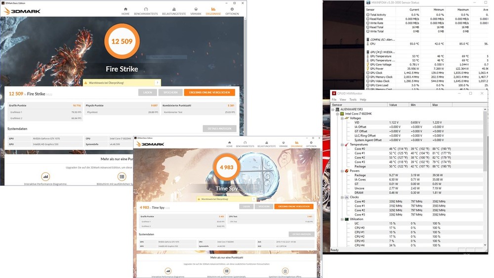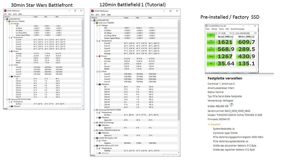 11. Hallo zusammen, ich habe nun auch seit zwei Tagen meinen erstes AW- Notebook. Bestellt wurde folgende Konfiguration: Basis Cassini 15, CTO Prozessor Intel® Core™ i7-6820HK (4 Kerne, dynamisch übertaktet bis zu 4,1 GHz, 8 MB Cache) Betriebssystem Windows 10 Pro (64 Bit) - Englisch, Niederländisch Französisch, Deutsch, Italienisch Grafikkarte NVIDIA® GeForce® GTX 1070, 8 GB GDDR5 LCD IPS-Display, 15,6'', Full HD (1.920 x 1.080), reflexionsarm, 300 cd/m² Arbeitsspeicher 8 GB DDR4-Speicher (1 x 8 GB), 2400 MHz Festplatte PCIe-SSD-Startfestplatte, 512 GB + SATA-Speicherfestplatte, 1 TB (7.200 1/min), 6 Gbit/s Wireless-Netzwerkanbindung Killer 1535 (802.11ac, 2x2, Wi-Fi, Bluetooth 4.1) Erster Eindruck, sehr gutes Gehäuse, ganz leichtes Bleeding in zwei Ecken des Bildschirms! Nach Setup-Abschluss und System Updates habe ich dann mal erste Belastungstest durchgeführt. Ich habe nachträglich noch den Speicher (2x Ballistix Sport LT 8GB Single DDR4 2400) auf 16GB erweitert /ersetzt und die 1TB HDD duch eine Samsung EVO 850 SSD (Datenspeicher) ausgetauscht.Anbei hierzu nun ein paar Bilder im Anhang.