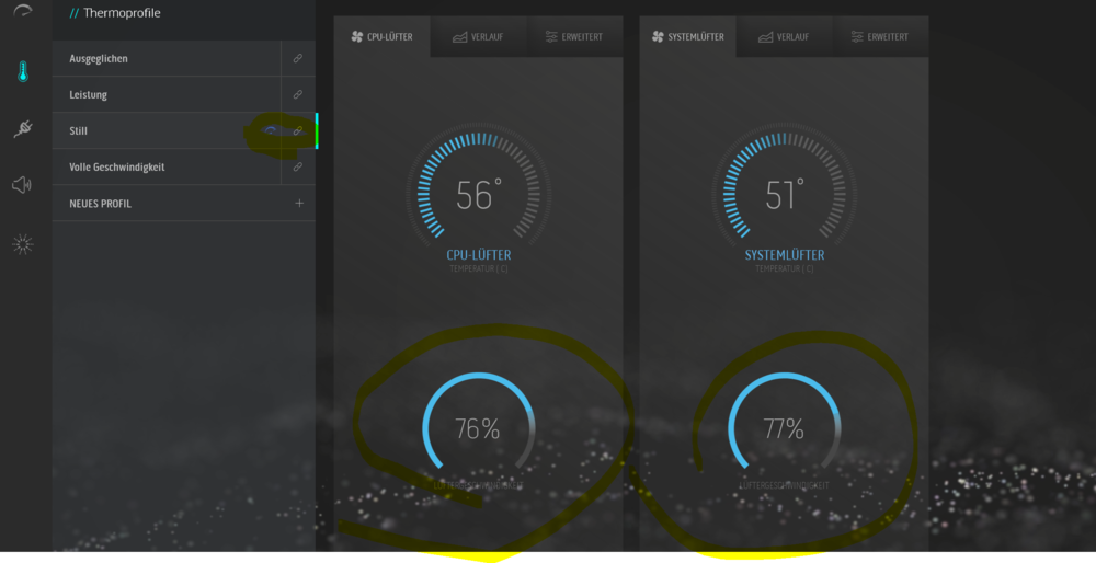 Hallo Community, weiß jemand warum meine Lüfter immer egal bei welchem Spiel immer auf 100% laufen. Im Command Center habe ich "ausgeglichen" eingestellt. An den Temperaturen kann es eigentlich nicht liegen. Die sind z.B. bei PUBG bei 65°C pro CPU Kern. Die GPU ist bei 52°C. Nachtrag: Habe im Bios entdeckt, dass es verschiedene Lüfter-Profile gibt. Früher gab es hier ja immer nur Fan Performance Mode AN/AUS. Hab das mal von ausgeglichen auf silent gestellt. Im AW Controll Center kann ich die Lüfterprofile aus dem Bios auch wieder erkennen. Ein Abgleich hat hier jedoch anscheinend nicht statt gefunden, im AWCC steht das Lüfterprofil immernoch auf ausgeglichen. Hatte das AWCC auch mal komplett deinstalliert und wieder installiert, hatte aber nichts gebracht. Ich schaue nun mal wie sich die Bios Einstellungen verhalten, teilweise kommt nämlich bei der CPU nur "kalte" Luft weil er schon so weit runtergekühlt hat. Hier wäre definitiv noch Spielraum für leisere Lüfter. In Benchmarks wie z.B. OCCT oder Cinebench ist der CPU Lüfter unter Vollast jedoch sehr zurückhalten und bei ca. 65-70% RPM. Ich prüfe bei Gelegenheit mal weiter. -