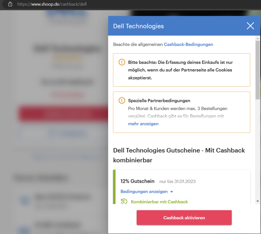 Da einige von euch planen sich ein neues Alienware zuzulegen, kommen diese Gutscheine gerade genau richtig Gültig bis 03.02. -15% auf Alienware Notebooks und Desktops: SAVE15GAMING -6% über Shoop Für die Personen die auch Shoop nutzen (kann ich nur empfehlen) gibt es nochmal bis zu 9% Rabatt auf den Nettopreis. Auszahlung ca. nach 3 Monaten. Dazu solltet ihr euch vorab einen Account bei Shoop erstellen und Cookies im Browser zulassen oder das Shoop-addin installieren. Die Bestellung sollte dann über den Link der Shoop Webseite abgeschlossen werden "Cashback aktivieren". Bis zum Abschluss der Bestellung nicht die Browserfenster schließen, am besten einfach ne ganz frische Browsersession vor dem gesamten Prozess aufmachen. Das erfasste Cashback sollte dann nach Bestellbestätigung ca. innerhalb von 24h in eurem Shoop Konto sichtbar sein.