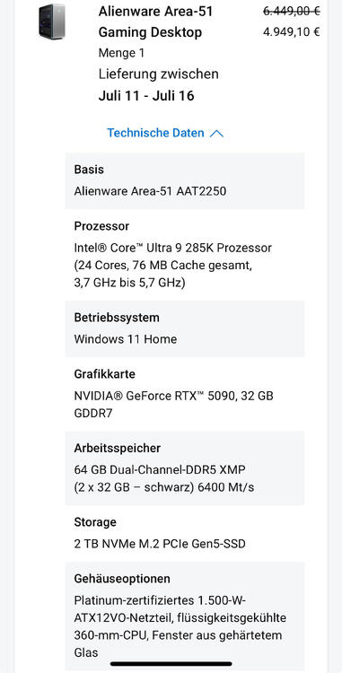 Habe nun auch nochmal neu bestellt, da ich für den gleichen Preis nun RTX 5090, 64GB RAM, 2TB Gen5 SSD und die 4K Kamera erhalte. 4.039,09€ <-- 100€ Gutschein + 10% Rabatt ... shoop wurde leider noch nicht getracked Habe aber irgendwie immer noch keine Bestellbestätigung erhalten, obwohl die Bestellung in meinem Dell Konto komplett registriert ist Bei shoop.de gibt es nun 6% Rabatt + 100€ Gutschein, das wäre schon sehr gut... hoffe das klappt noch -